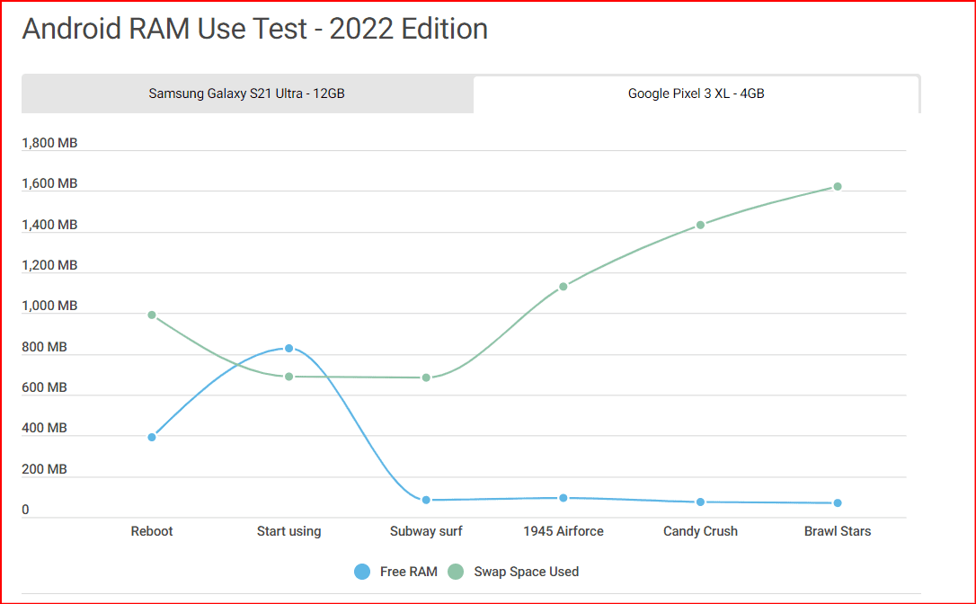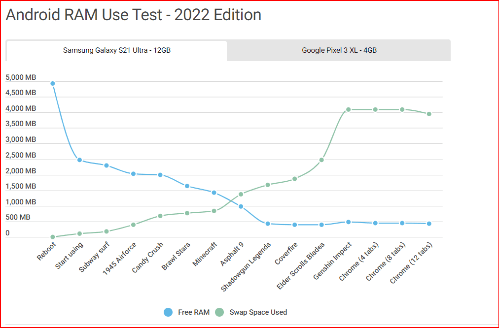 برای اینکه مشخص شود چه میزان رم واقعا برای یک گوشی اندرویدی کافی است، تستی روی سه گوشی گلکسی اس ۲۱ اولترا با ۱۲ گیگابایت رم، وانپلاس ۹ پرو با ۸ گیگابایت رم و پیکسل ۳XL با ۴ گیگابایت رم صورت گرفت. دو گوشی سامسونگ و گوگل از اندروید ۱۲ بهره میبردند و وانپلاس هم اندروید ۱۱ را روی خود نصب شده میدید. در هر گوشی، میزان رم آزاد و در دسترس و همچنین میزان رم swap space استفاده شده هم ذکر شد.