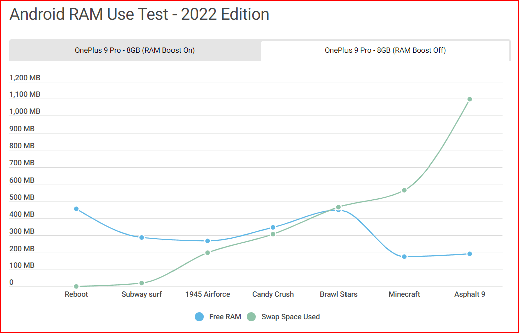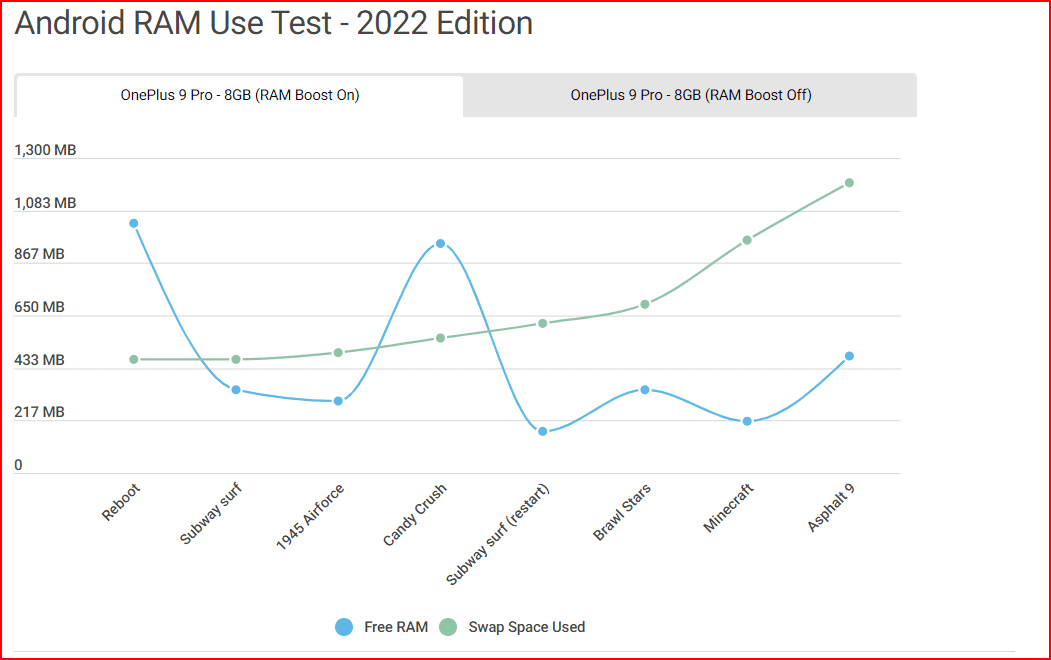 این قابلیت بیشترین فایدهی خود را زمانی نشان میدهد که برنامهها بسته باشند، سپس با پیشبینی اینکه چه اپهایی را بیشتر از سایرین استفاده میکنید، آنها را برای بارگذاری سریعتر آماده میکند. بنابراین برای اینکه مشخص شود آیا ۸ گیگابایت رم برای یک گوشی اندرویدی کافی است یا خیر باید وانپلاس ۹ رو یک بار با فعال بودن رمبوست و بار دیگر با غیرفعال بودنش مورد بررسی قرار میدادیم که نتیجهی آن به شرح زیر است.