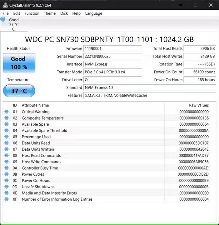 - اجرای برنامه: پس از نصب، CrystalDiskInfo را باز کنید. برنامه به طور خودکار درایوهای SSD و HDD متصل به سیستم شما را شناسایی کرده و اطلاعات مربوط به هر یک را نمایش میدهد.