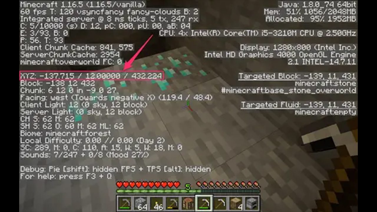 برای یافتن عدد لایه خود در نسخه Java کافی است دکمه F3 و در برخی رایانهها دکمههای Fn+F3 را فشار دهید. در نسخه Bedrock به بخش تنظیمات رفته و گزینه Show Coordinates را فعال کنید. پس از آن، شما اطلاعات زیادی را در صفحه تماشا میکنید. در سمت چپ صفحه، خطی که با عبارت XYZ آغاز شده، مختصات شما در دنیای بازی را نمایش میدهد. برای مثال اگر مختصات شما: