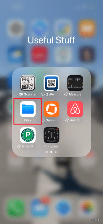 - اپلیکیشن Files را باز کنید. این اپلیکیشن معمولا در گوشیهای آیفون به رنگ آبی و به شکل یک پوشه است. اگر این اپ را پیدا نمیکنید، کافی است به سمت چپ سوایپ کرده و به لیست برنامهها در App Library دسترسی پیدا کنید. در آنجا میتوانید نام Files را در بخش جست و جو وارد کرده و آن را باز کنید.