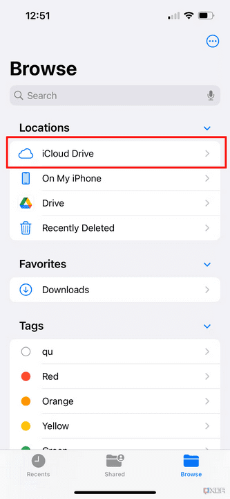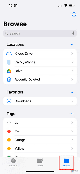 - در بین گزینههای پایین صفحه، روی Browse کلیک کرده و سپس iCloud Drive یا On My iPhone را انتخاب کنید.