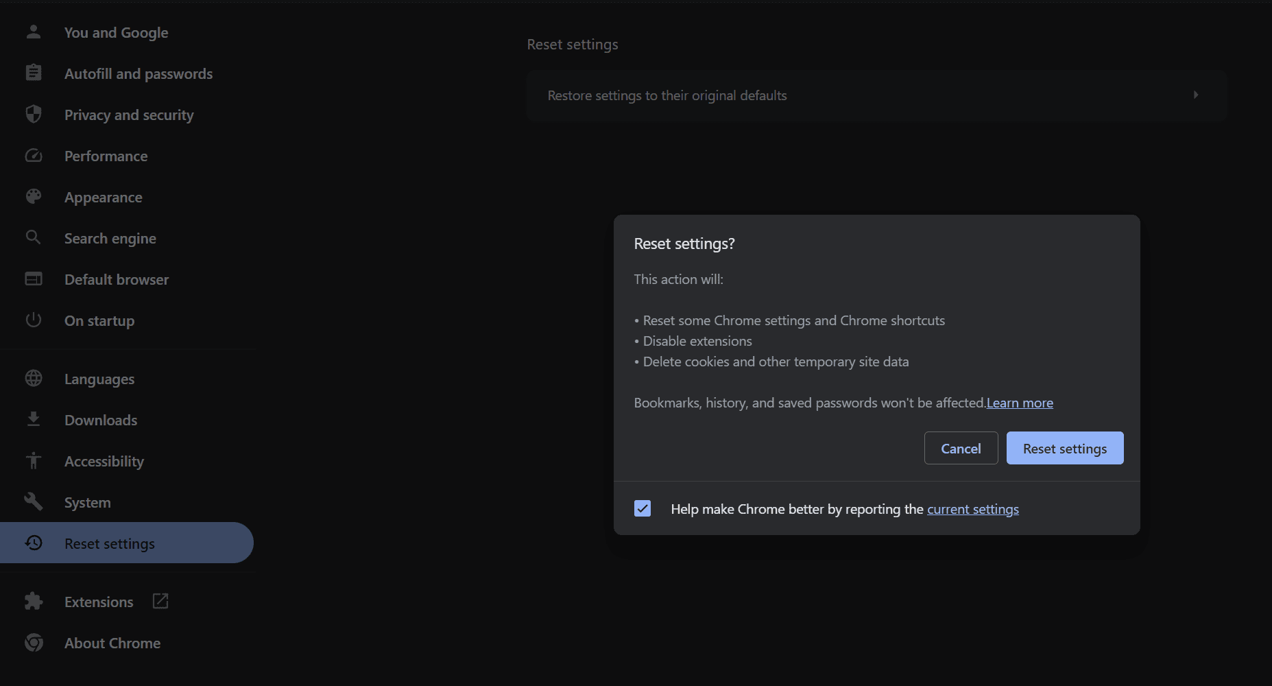 - اگر از جدیدترین نسخهی کروم استفاده میکنید، با کلیک روی تنظیمات، در سمت چپ پنل فقط کافی است روی گزینهی Reset settings کلیک کنید و سپس روی گزینهی Reset settings کلیک کنید.