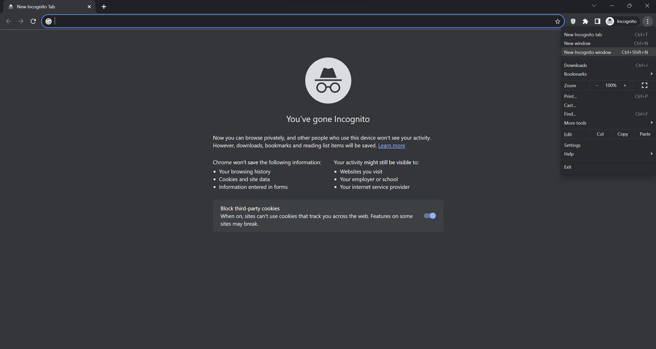 برای اینکه وارد حالت Incognito شوید کافی است گوگل کروم را باز کرده و در سمت راست-بالای صفحه، روی آیکون سه نقطه کلیک کنید. سومین گزینه در منوی به نمایش درآمده، همین حالت است. روی آن کلیک کنید تا به حالت ناشناخته وارد شوید. همچنین میتوانید در منوی گوگل کروم، با فشردن کلیدهای ترکیبی کنترل + شیفت + N، وارد این مود شوید.