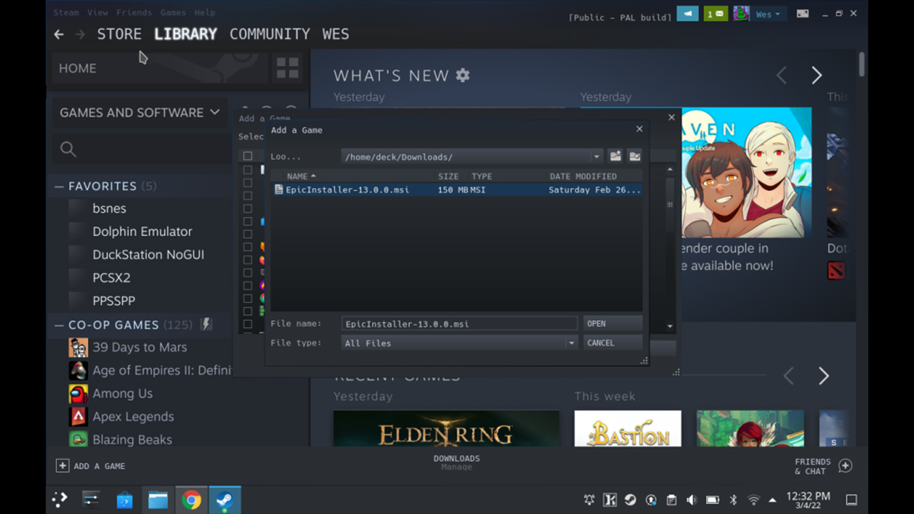 پس از ورود به بخش دانلودهای خود، گزینه بخش File types را به All files تغییر داده تا بالاخره فایل دانلود شده Epic Installer را مشاهده کنید. این فایل را با انتخاب گزینه Open به لیست non-Steam games افزوده و سپس گزینه Add Selected Programs را انتخاب کنید.