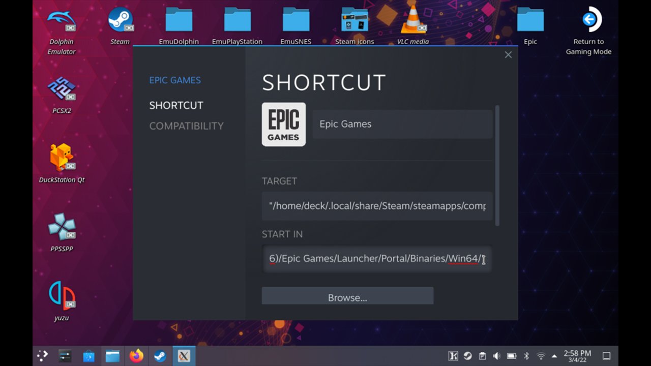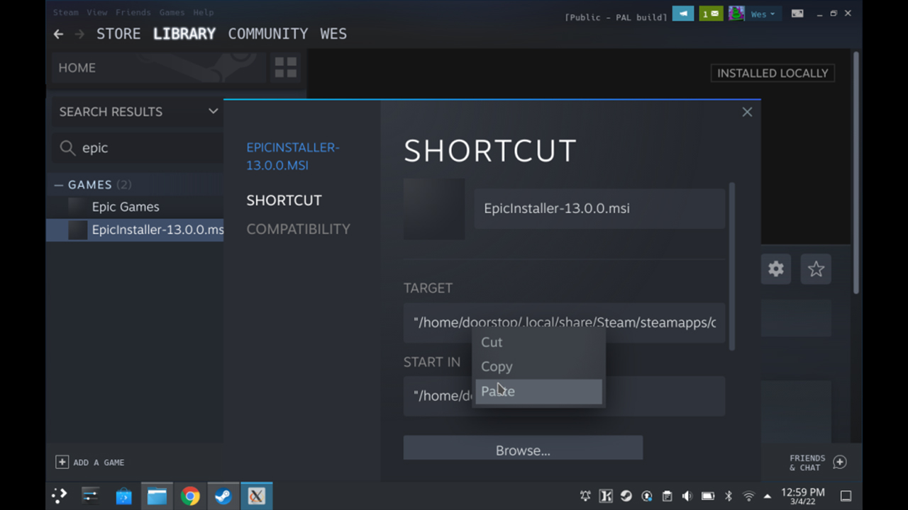 ۸. به استیم برگشته، در کتابخانه خود روی برنامه Epic Installer کلیک راست کرده، وارد Properties و سپس وارد Shortcut شوید. پس از بازگشایی بخش جدید، در بخش Target کلیک راست کرده و گزینه Paste را انتخاب کنید. با استفاده از صفحه کلید کنسول در ابتدا و انتهای مسیر کپی شده علامت نقل قول انگلیسی (“) اضافه کنید. شما باید دقیقا همین مراحل را در بخش پایین که Start In نام دارد انجام دهید، با این حال باید نوشته EpicGamesLauncher.exe را از انتهای مسیر حذف کنید، چون ما در این بخش قصد داریم پوشهای که لانچر در آن وجود دارد را به استیم معرفی کنیم. به خاطر داشته باشید که در این بخش نیز باید علامت نقل قول انگلیسی در ابتدا و انتهای مسیر افزوده شود.
