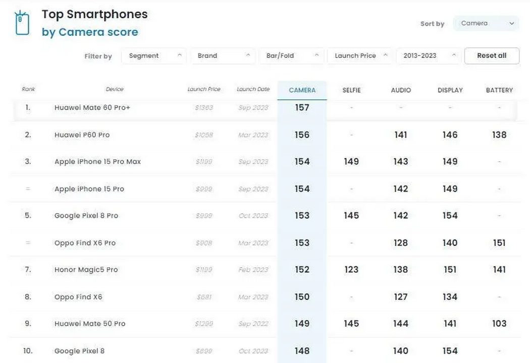 هواوی میت ۶۰ پرو پلاس، در تستهای DxOMark مطابق روال سالهای گذشته موفق شد رتبهی نخست را برای هوای به ارمغان بیاورد و بالاتر از تمام گوشیهای دیگر، عنوان بهترین گوشی ۲۰۲۳ از لحاظ دوربین را تصاحب کند. این در حالی است که امسال گوشیهای بسیار قدرتمندی از این لحاظ راهی بازار شدهاند که از جمله معروفترین آنها میتوان به سری آیفون ۱۵ اشاره کرد.