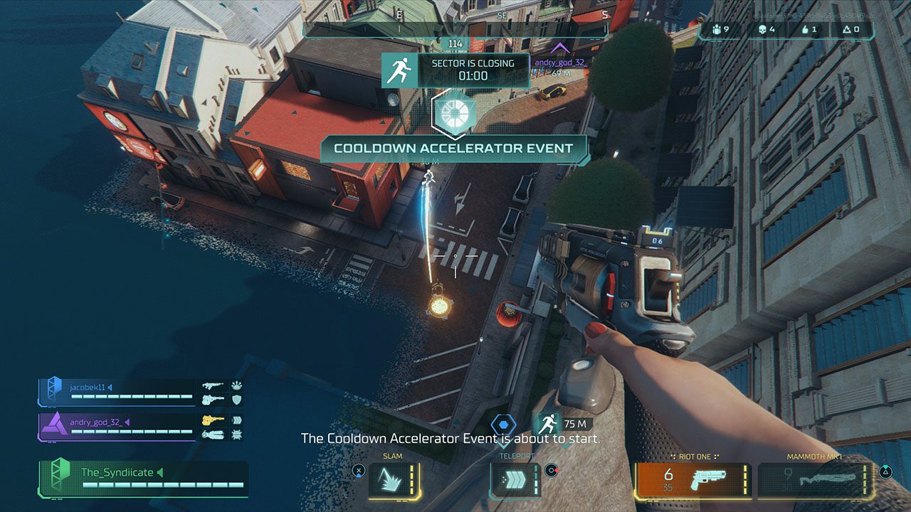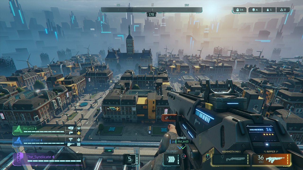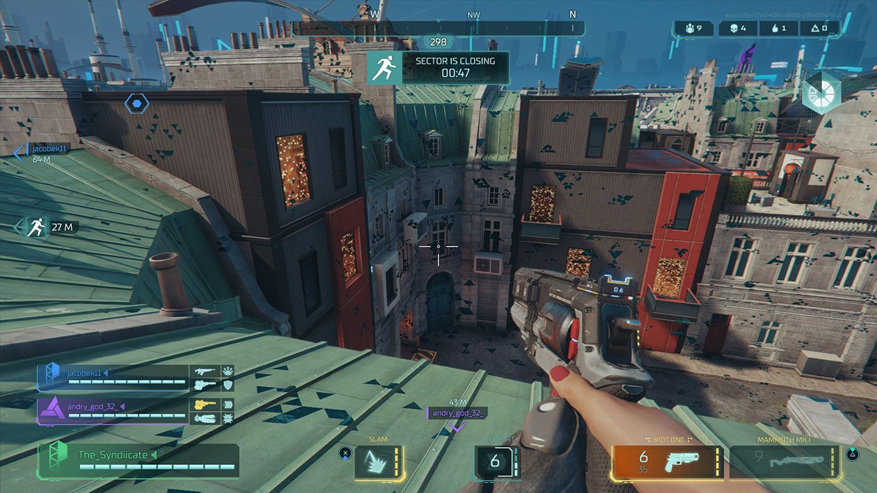 ستارهی این بازی بدون شک گیمپلی سریع و پرهرج و مرج آن است. بازیکنان با سرعتی سرسامآور در کسری از ثانیه از جلوی صفحهی نمایشتان رد میشوند یا به اندازهی یک برج ۱۰ طبقه به هوا میپرند. جریان گیمپلی و سرعت جابجایی Hyper Scape به قدری بالاست که باعث میشود Apex Legends در مقایسه با آن، بیشتر شبیه به کُندی Rainbow Six Siege باشد. به هیچ وجه نمیتوان گفت که یکی بهتر از دیگری است؛ چون تِم و حسی که سازندگان بازیها میخواهند به شما منتقل کنند کاملا فرق دارد. هایپر اسکیپ شدیدا هیجانانگیز و لذتبخش بوده و آدرنالین خون شما را بالا میبرد؛ بهطوری که باید اول تیر بزنید، بعد فکر کنید که استراتژی شما چیست، در صورتی که ایپکس لجندز با جریان آهستهتر خود توانایی نشانهگیری شما را میآزماید و باید با تصمیمات حساب و کتاب شده بازی را پیش ببرید. وقتی به جابجایی هایپر اسکیپ فکر میکنید، بازی Quake یا DOOM را در نظر داشته باشید. حال گیمپلیای با همان حس و حال را به یک بتل رویال افزوده و نتیجهی آن تجربهی بینهایت خوشآیندی به نام Hyper Scape میشود.