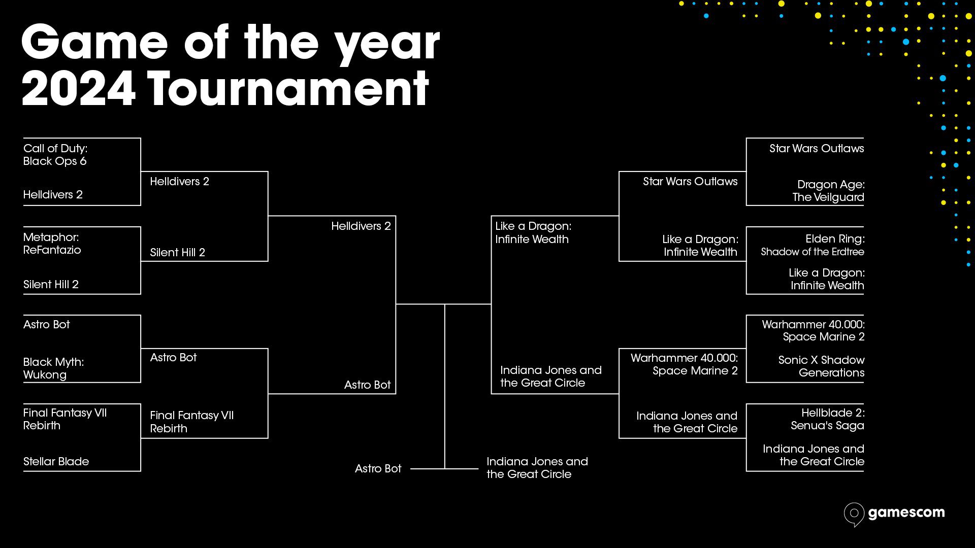 در همین راستا، مدتی پیش نظرسنجی بهترین بازی سال ۲۰۲۴ میلادی در مراسم گیمزکام بر اساس آرای گیمرها برگزار شد که عناوین سرشناسی همچون هل بلید ۲، ایندیانا جونز، آسترو بات، هل دایورز ۲، ریمیک سایلنت هیل ۲، کالاف دیوتی بلک اپس ۶، بلک میث ووکونگ و استلار بلید در این تورنمنت با یکدیگر به رقابت پرداختند.