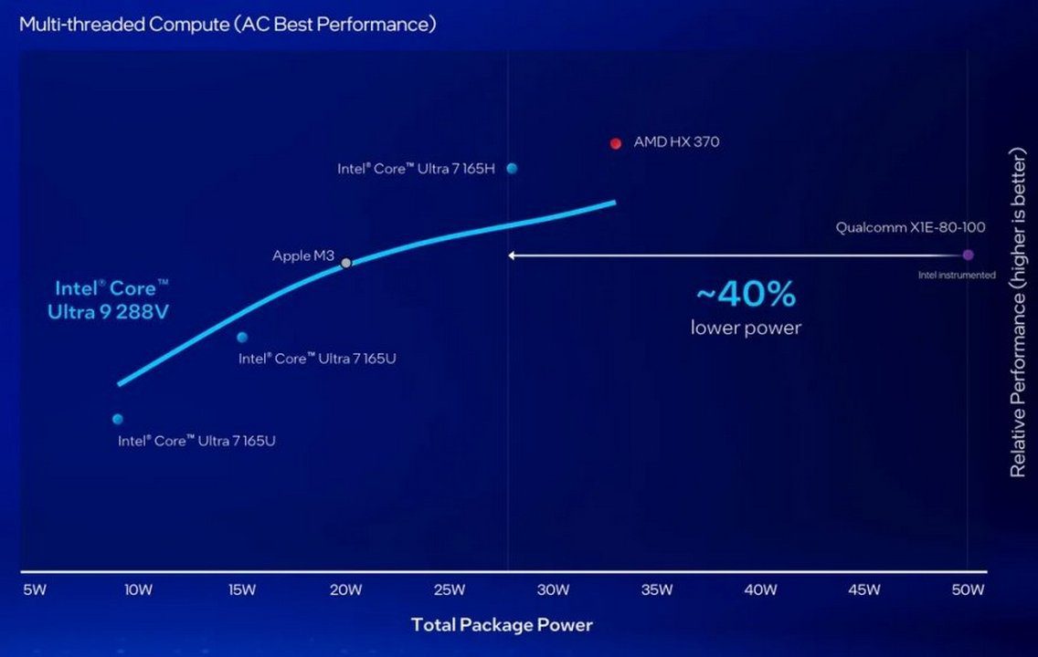 اینتل معتقد است که پردازنده های Core Ultra 200V میتوانند در مصرف انرژی پایین، عملکرد بهتری نسبت به پردازندههای نسل قبلی خود مانند Meteor Lake و همچنین تراشههای AMD HX 370 ارائه دهند. اما در شرایطی که توان بیشتری در دسترس باشد، پردازندههای نسل قبلی اینتل و تراشههای رقبای قدرتمند مانند AMD میتوانند عملکرد بهتری داشته باشند. این موضوع نشان میدهد که در شرایط مختلف، نیاز به انتخاب هوشمندانه مدل مناسب از پردازندههای لونار لیک وجود دارد.