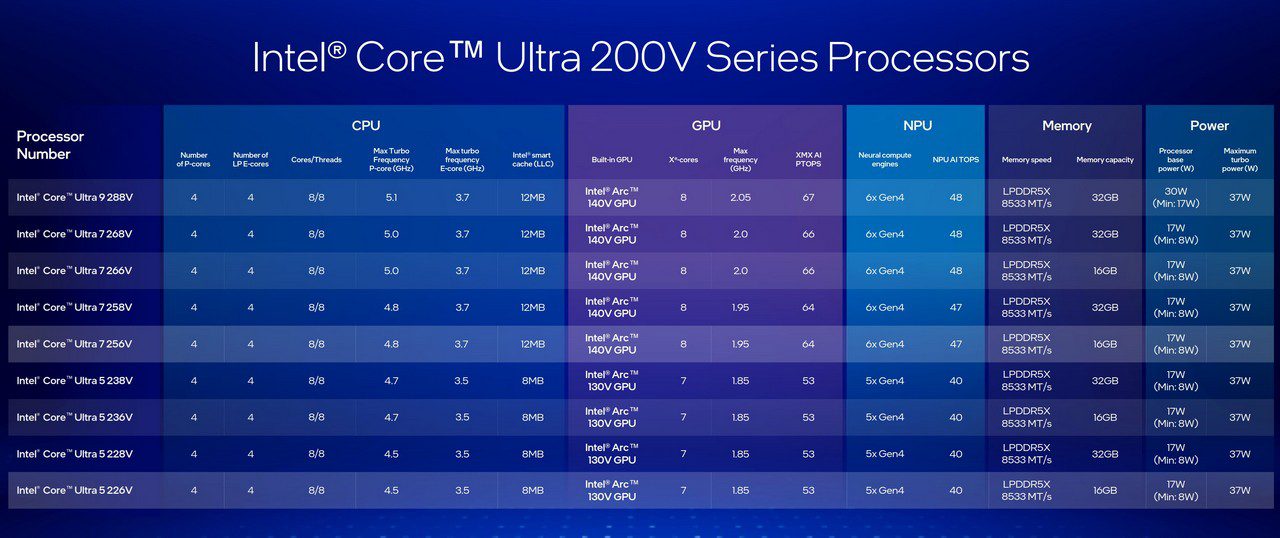 برای درک بهتر ساختار نامگذاری پردازنده های Core Ultra 200V اینتل، باید بدانید که نام معمولی آنها به شکلی مانند «Core Ultra 7 258V» خواهد بود. در این سیستم نامگذاری، هر پردازنده شامل چهار هسته عملکردی، چهار هسته کممصرف، حداقل هفت هسته GPU، و پنج موتور محاسبات عصبی (AI) است. اکثر تراشهها همچنین دارای توان طراحی حرارتی پیشفرض 17 وات هستند.