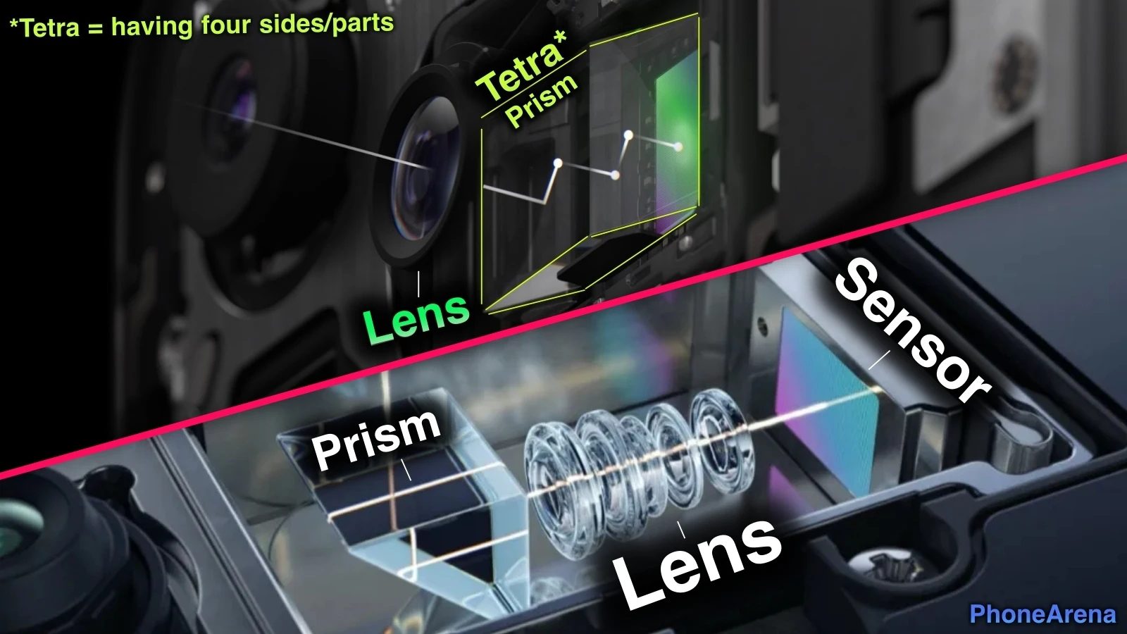 اما اینطور که پیداست، ظاهرا اپل توانسته یک طراحی خاص برای دوربین زوم توسعه دهد که آیینهی تتراپریسم نام دارد. این طراحی برخلاف دوربین پریسکوپی، بسیار جمع و جورتر و کوچکتر است و این اجازه را میدهد تا دوربین از سنسور به مراتب بزرگتری استفاده کند (۲۵٪ بزرگتر از سنسور تلهفوتوی آیفون ۱۵ پرو) و در نتیجه نور بیشتری را هم جذب کند. اینگونه شد که آیفون ۱۵ پرو مکس توانست دوربینی با زوم ۵ برابری اپتیکال داشته باشد، نه اینکه واقعاً دوربین پریسکوپی درون آن استفاده شده باشد.