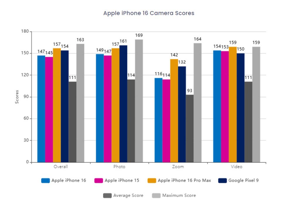 DxOMark نتایج آزمایش دوربین آیفون 16 را منتشر کرده است و فکر میکنید چه اتفاقی افتاد؟ این گوشی پرچمدار اپل با امتیاز کلی 147 توانسته گلکسی S24 اولترا سامسونگ را که امتیاز 144 را کسب کرده بود شکست دهد. اما همچنان پشت سر گوگل پیکسل 9 با امتیاز 154 قرار دارد.