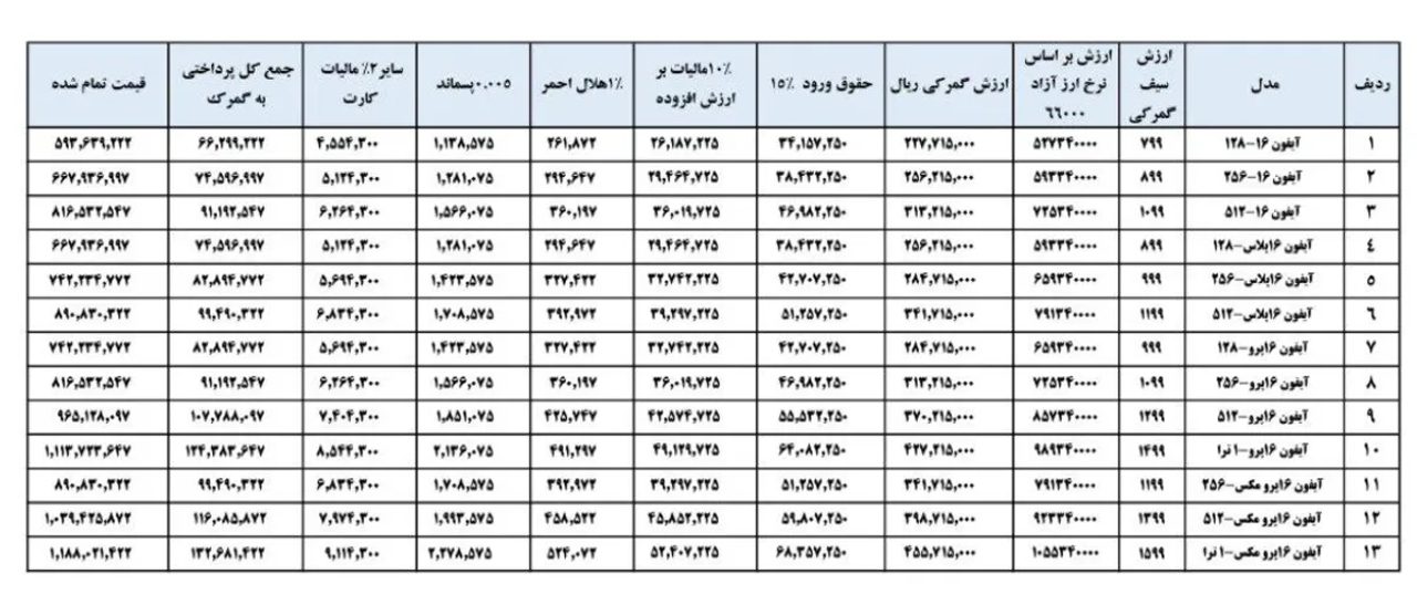 سازمان گمرک اخیراً قیمت نهایی مدلهای مختلف آیفون ۱۶ از جمله نرمال، پرو، و پرو مکس را برای واردات تجاری و مسافری تعیین کرد. طبق مصوبه جدید، تعرفه واردات برای رویه تجاری ۱۵ درصد و برای واردات مسافری ۳۰ درصد در نظر گرفته شده است. این جدول شامل تمام هزینههای مرتبط مانند مالیات بر ارزش افزوده، سهم هلال احمر، هزینه پسماند، و مالیات کارت است که در محاسبه قیمت نهایی نقش دارند. نرخ ارز ETS برای واردات نیز ۲۸ هزار و ۵۰۰ تومان تعیین شده است که بر اساس آن، قیمت نهایی گوشیها محاسبه میشود.