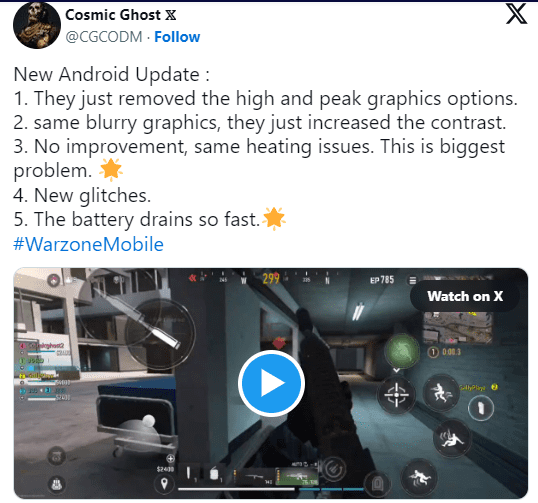 از وقتی نسخه جهانی عرضه شده، بازی پرحاشیه کالاف دیوتی وارزون موبایل بهخاطر مشکلات کوچک و بزرگ متعددی مثل پایین بودن گرافیک، افت فریم ریت، داغ شدن بیش از حد دستگاه، ارور GPU، عدم اتصال به سرورهای اکتیویژن، قرار گرفتن بازیکنان موبایل با بازیکنان کنسول در یک لابی و باگهای فراوان، مورد انتقاد شدید قرار گرفته است. شمار شکایات بهقدری زیاد بود که اکتیویژن هفته گذشته با انتشار تصویری در صفحه توییتر خود، از آماده سازی یک آپدیت که همه مشکلات نسخه اندروید بازی را برطرف میکند، خبر داد. در ادامه میتوانید جزئیات آپدیت نسخه اندروید را مشاهده کنید: