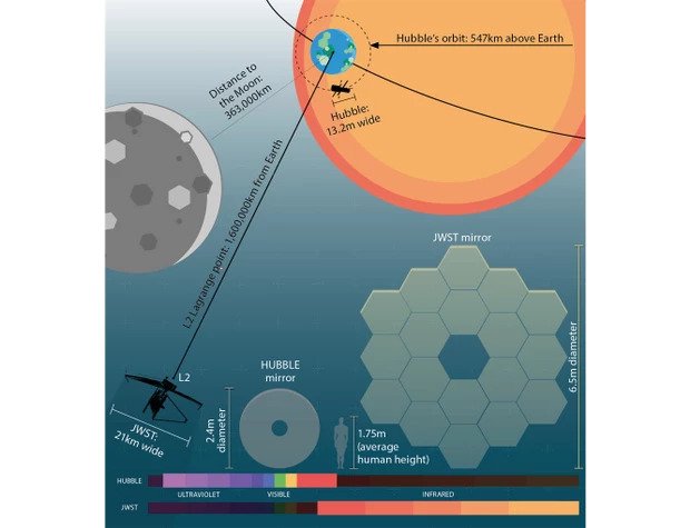 البته لازم به ذکر است که تلسکوپ فضایی جیمز وب و تلسکوپ فضایی هابل جنبههای مختلفی از فیزیک را روایت خواهند کرد؛ زیرا هابل نور مرئی را مطالعه کرده است و جیمز وب امواج فروسرخ را بررسی خواهد کرد. اگر چه وضوح جزییات به یک اندازه خواهد بود، اما نتیجه دو چیز متفاوت را نشان خواهد داد.