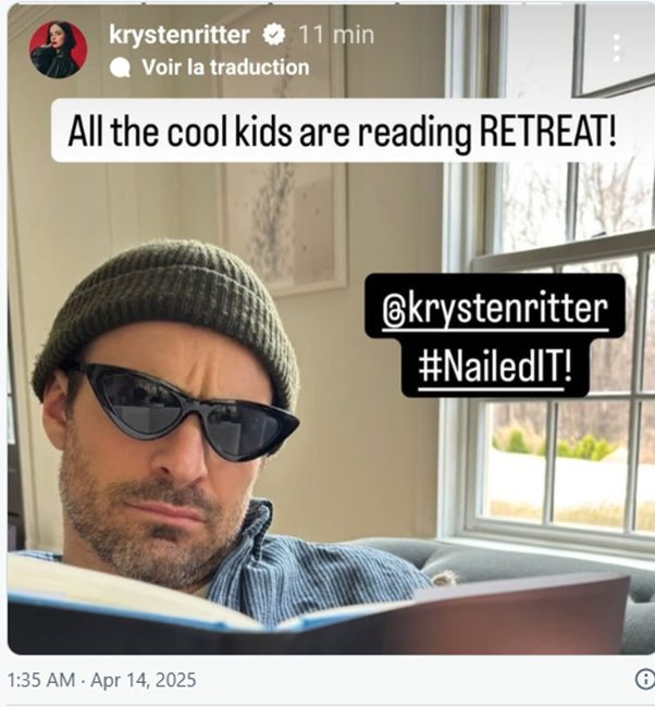 در این استوری، کریستین ریتر این متن را بدین شرح ضمیمه کرده است: “تمامی بچهها باحال در حال خواندن کتاب Retreat! هستند.” در این عکس چارلی کاکس در حالی که یک عینک آفتاب بر چهره دارد و کتاب جدید ریتر را در دست دارد مشاهده میشود.