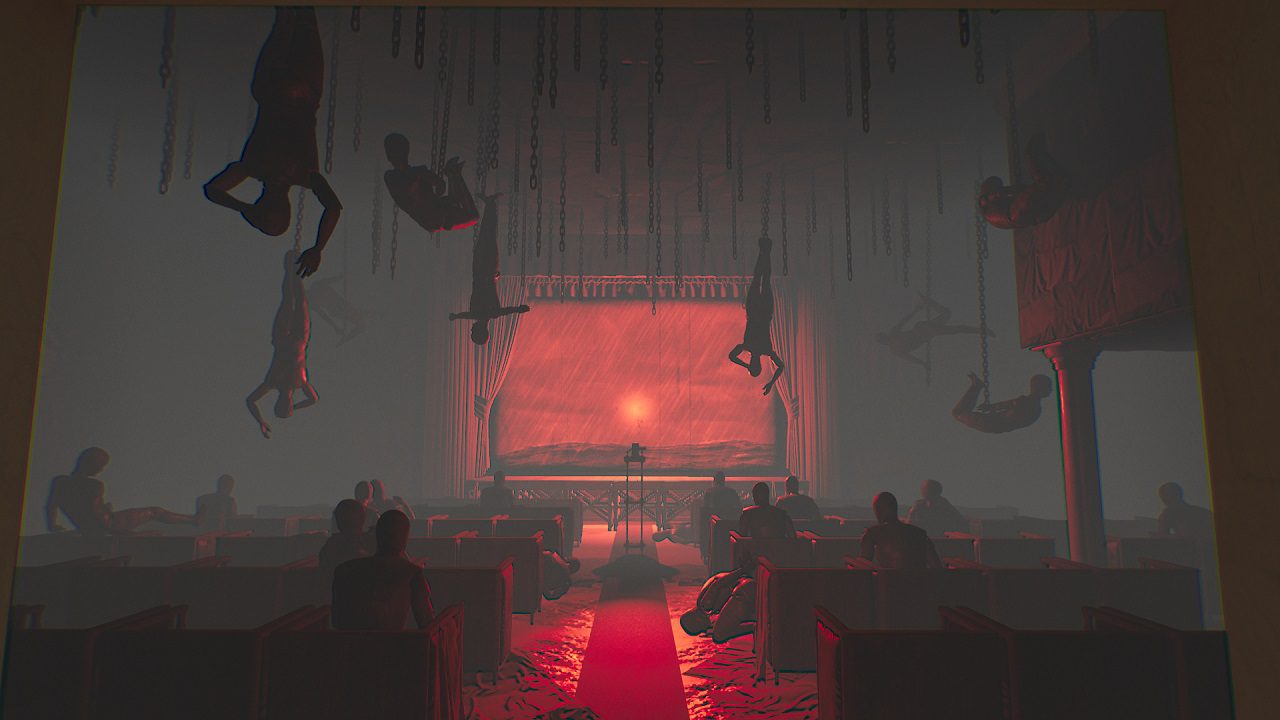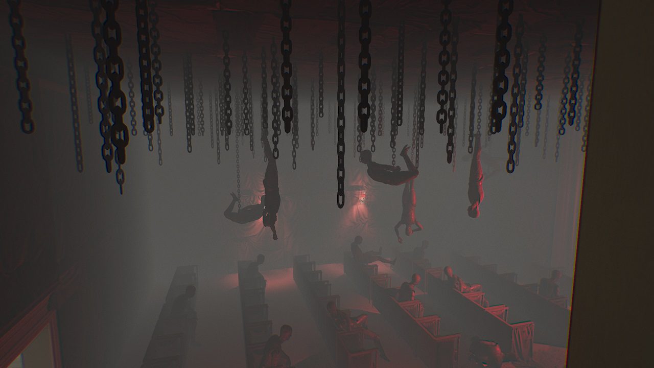 با وجودی که Layers of Fear 2 همانند نسخه اول از موتور Unity استفاده میکند، ولی ماهیت بصری بازی نسبت به نسخه قبل پیشرفت چشمگیری داشته است. دیگر شاهد افت فریمهای شدیدی که در نسخه اول بودیم، نیستیم. نورپردازی و سایهها به خوبی کار شدهاند، البته به جز بعضی از راهپلهها که نورپردازیشان شدیداً مصنوعی به نظر میرسد. یکی از نقاط قدرت بازی طراحی هنری بازی است که شما را به یاد نقاشیهای سالوادور دالی میاندازد. استفاده به جا از رنگ قرمز نه تنها فوبیای ترس از خون را در شما زنده میکند، بلکه در کنار رنگهای سیاه، سفید و خاکستری این احساس را به شما القا میکند که در حال تماشای یک تابلوی نقاشی هستید. نقطه اوج این خلاقیت را زمانی احساس میکنید که وارد سالن سینما میشوید. سینمایی با تم قرمز و مانکنهایی که از زاویههای مختلف از سقف آویزان شدهاند. این تنوع و سلیقه در طراحی و رنگآمیزی در تمامی لوکیشنهای بازی تکرار میشوند تا جایی که حتی راهروها برای شما ظاهر یکسانی نخواهند داشت. نکتهی ترسناک ماجرا آن جایی است که متوجه میشوید یکی از ابعاد ترسی که در هر لحظه از بازی شما را تحتالشعاع خود قرار میدهد؛ اتمسفر خلق شده از این رنگآمیزی است. از آنجایی که ما با یک بازی تراز اول یا AAA سرو کار نداریم، باید انتظار داشته باشیم شاهد نواقص جزیی در بافتها باشیم. در مجموع میتوان گفت گرافیک بازی نه تنها نسبت به نسخه اول پیشرفت قابل توجهی داشته بلکه به عنوان یک بازی مستقل نمره قابل قبولی را در این بخش دریافت میکند.