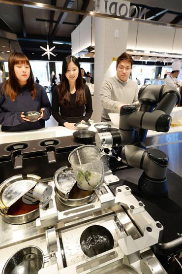 ربات آشپز ال جی در یک رستوران خانوادگی در کره جنوبی به نام CJ Foodville در قسمتی از آشپزخانه به تهیه نودل مشغول میشود.