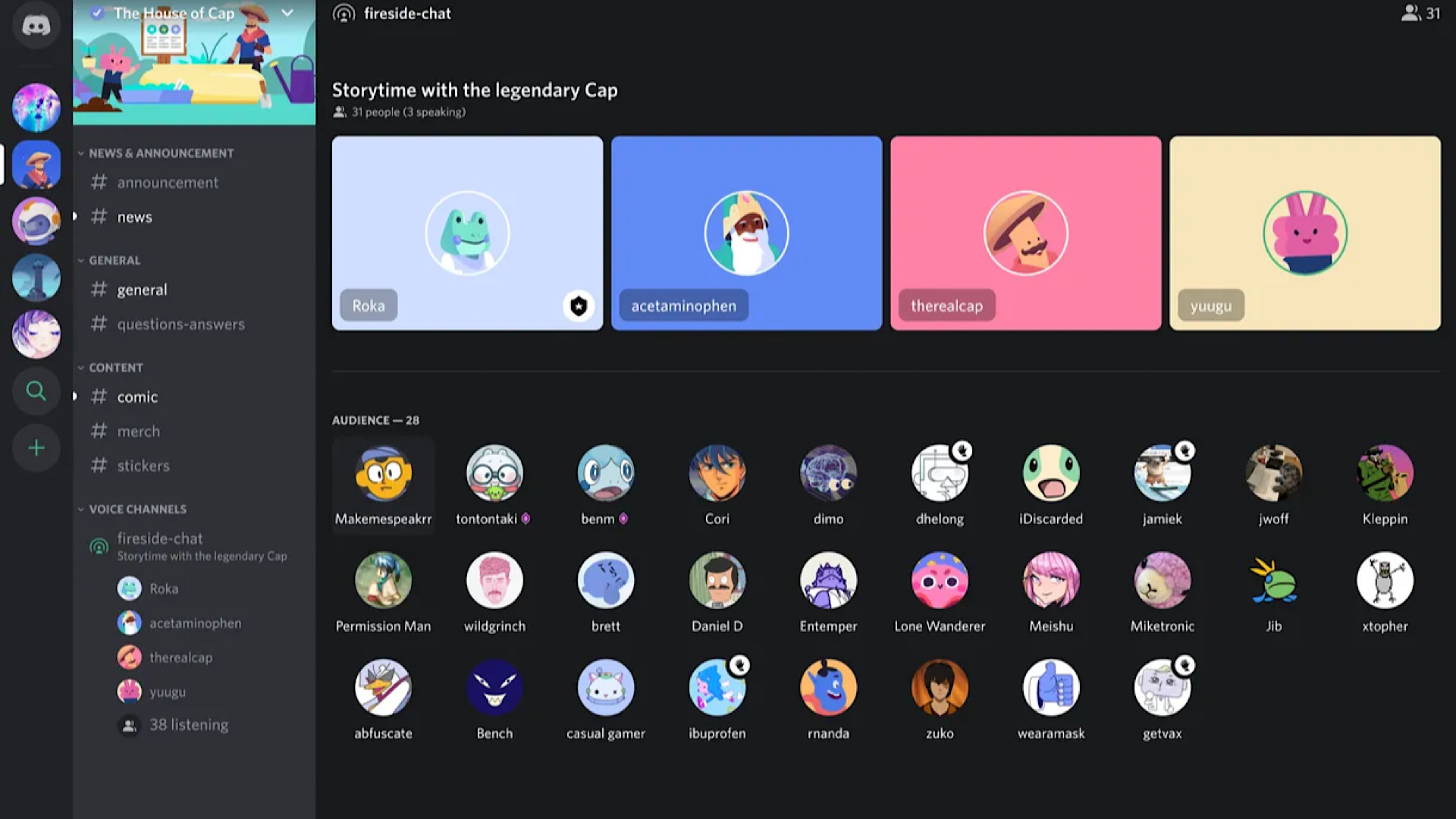 همانطور که در بالا اشاره کردیم یکی از مشکلات برنامه کلاب هاوس این است که تنها کاربران iOS میتوانند از آن استفاده کنند، اما کاربران برنامه Discord میتوانند در اکثر پلتفرمها از این ویژگی صوتی جدید بهره ببرند، به همین دلیل یکی از بزرگترین رقیبهای کلاب هاوس، برنامه دیسکورد است، شما میتوانید در تصویر زیر یک کانال Discord Stage را که در ویندوز ساخته شده است را مشاهده کنید.