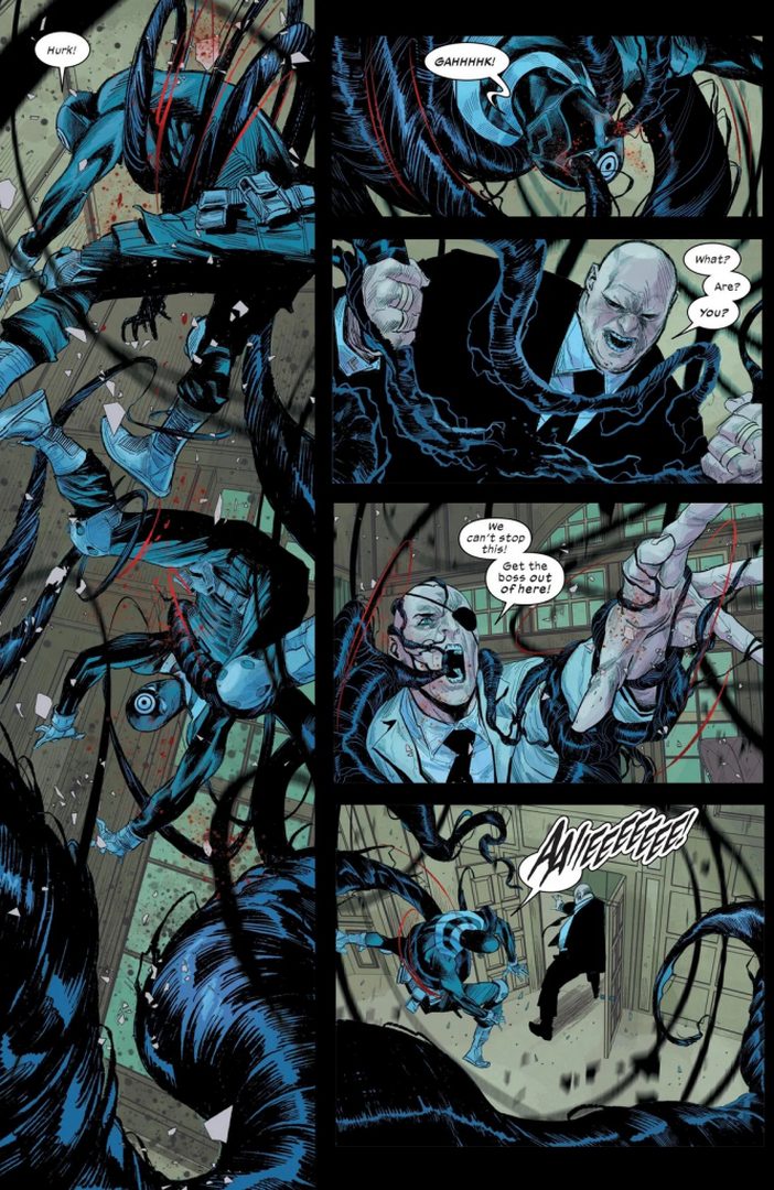 شکلگیری او کاملاً متفاوت بود. ظاهری غولپیکر، دندانهای تیز، و تاندریلهایی که از بدنش بیرون میزدند و دشمنان را تکهتکه میکردند. یکی از نیروهای Bullseye حتی از ناحیه چشم مورد اصابت مستقیم قرار گرفت. فیسک و افرادش از شدت وحشت فرار کردند، و ونوم پدر فلیشیا را در سیلابی از نانوتک به دام انداخت. تنها چیزی که جلوی نابودی کامل را گرفت، بازپسگیری کنترل توسط خود ریچارد بود.