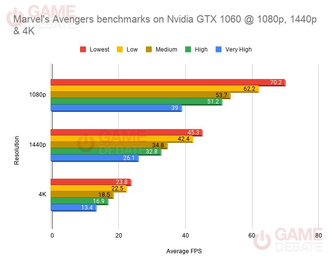 چالش اصلی با حالت High و بالاتر شروع میشود. جایی که حتی GTX 1060 که کارت پیشنهادی از سوی سازندگان است هم توان اجرای بازی به صورت 60 فریم را ندارد. کارت گرافیک GTX 1060 در High و Very High به ترتیب با 51 و 40 فریم در ثانیه به صورت میانگین توان اجرای بازی را دارد. تجربه بازی Marvel’s Avengers با همین مقدار هم خالی از لطف نیست. حتی با پایین آوردن تنظیمات تا سطح Medium میتوانید با همین کارت گرافیک به صورت 30 فریم در رزولوشن 2K یا همان 1440P به تجربه Marvel’s Avengers بپردازید.