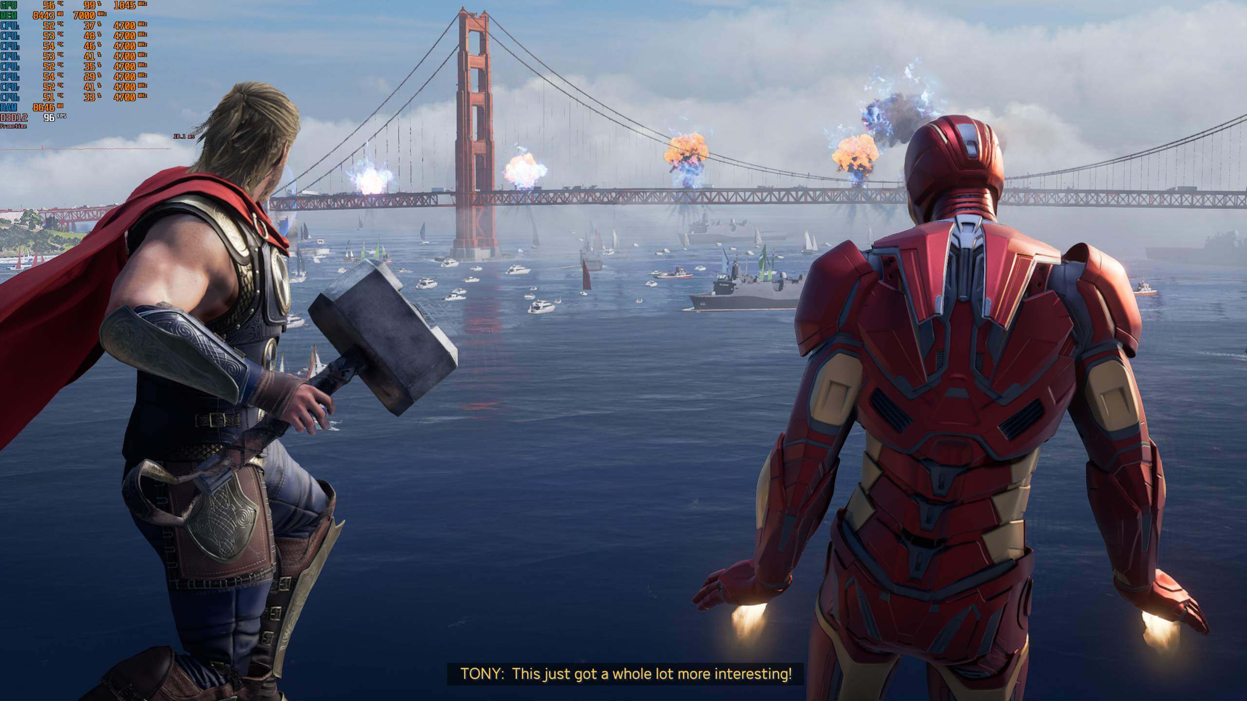 گل سر سبد کارت گرافیکهای انویدیا یعنی RTX 2080TI در بالاترین سطح ممکن یعنی ULTRA موفق به اجرای بازی صورت میانگین 40 فریم در ثانیه شده است. گرافیک بازی در این رزولوشن و تنظیمات گرافیکی خیره کننده است. به طوری که به راحتی میتوان لقب پیشنمایشی از گرافیک بازیها در نسل نهم را به Marvel’s Avengers اعطا نمود. نکته جالب اینکه در اکثر موارد فشار خاصی روی پردازنده وارد نیست و بار اصلی روی دوش کارت گرافیک است. معمولا در بازی شاهد استفاده از حداکثر توان کارت گرافیک هستیم. از طرف دیگر پردازنده آنچان هم تحت فشار نبوده و عموما کمتر از نیمی از توان خود را در اختیار بازی قرار میدهد. البته این موضوع برای هر پردازنده صدق نمیکند. برای مثال در تصویر زیر میتوانید مقایسه بین دو پردازنده I7-4930K و I9-9900K را مشاهده کنید.