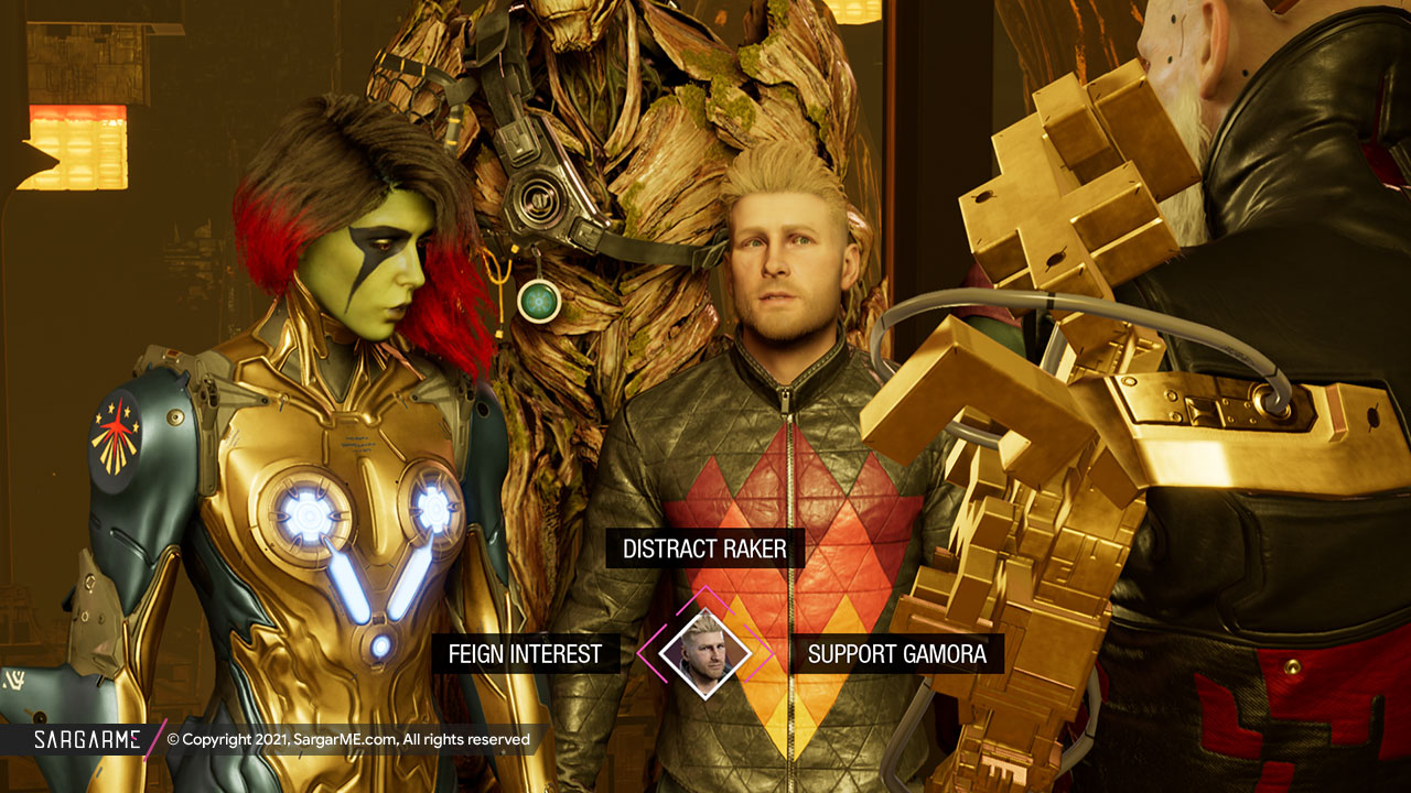 کاراکترهای دوست داشتنی و شخصیت پردازی خوب آنها یکی از مهمترین نکات مثبت و اصلیترین دلایل تجربهی بازی Marvel’s Guardians of the Galaxy هستند. شیمی بین شخصیتها از ابتدا خوب از آب درآمده و بازی سرشار از دیالوگها و اتفاقات خندهدار است. در بین مکالمات گروه قابلیت انتخاب دیالوگ نیز وجود دارد که روی روند مراحل بازی تاثیر مستقیم دارند. برای مثال انتخاب شما در بخشی از بازی روی مخفیانه یا اکشن بودن اتفاقات آن مرحله تاثیر گذار است اما این تصمیمات هیچ تاثیری روی پایان بازی نداشته و بازیکنان تجربهای خطی را پیش روی خود دارند. با این حال وجود چنین قابلیتی باعث شده تا جزئیات تجربهی افراد تفاوت هر چند اندکی با دیگر گیمرها داشته باشد.