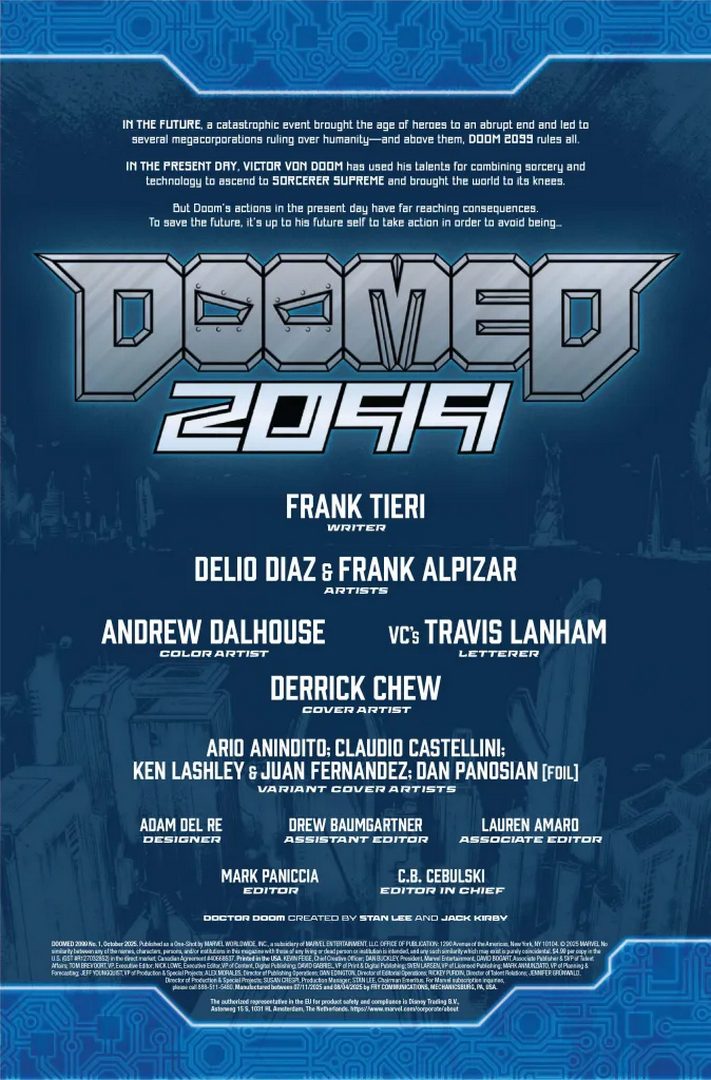 مارول در پیشنمایش شماره اول Doomed 2099 نوشتهی فرانک تیِری، دلیو دیاز، فرانک آلپیثار، اندرو دالهوس و تراویس لنهم، داستان تازهای از نبرد امپراتور دووم با قهرمانان چندجهانی را آشکار کرده است. در رویداد جاری One World Under Doom، اونجرز، چهار شگفتانگیز، ایکسمن و شیلد علیه دکتر دووم قیام کردهاند. شخصیتی که پس از شکست خوردن نزدیک به دست دورمامو تصمیم گرفته هیچگاه دوباره چنین ریسکی نکند. درست در همین لحظه که دوومباتها مشغول محاسبه تهدیدات هستند، ناگهان دووم 2099 در قلعه او ظاهر میشود.