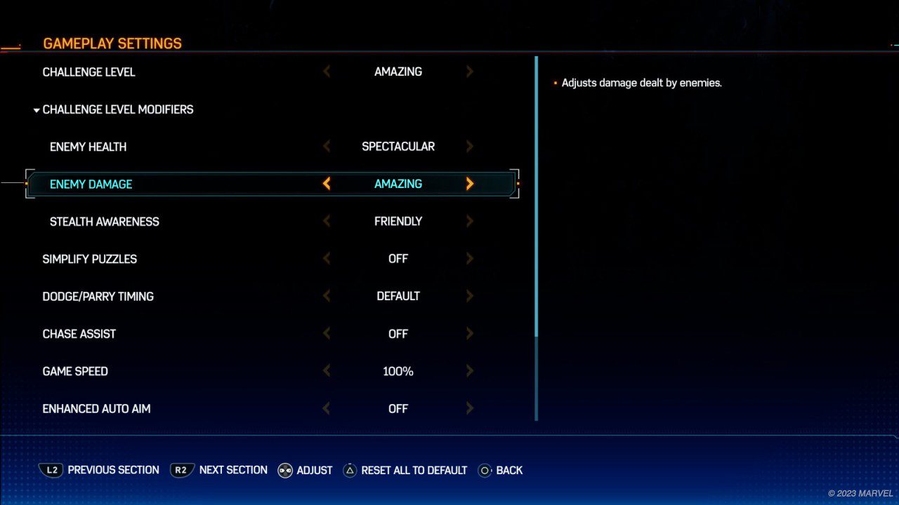 حالا با نزدیک شدن به تاریخ عرضه جهانی، استودیو اینسامنیاک گیمز در جدیدترین وبلاگ پلی استیشن از گزینههای دسترسی و تنظیمات بازی Spider-Man 2 صحبت کرده که یکی از بزرگترین و شوکهکنندهترین آنها Challenge Level Modifiers نام دارد. بهلطف این قابلیت میتوان برای اولین بار میزان سلامت دشمن، آسیب دشمن و آگاهی مخفیکاری را پوشش داد و روی گزینههای مختلفی مثل Amazing ،Friendly و Spectacular تنظیم کرد. سایر ویژگی و تنظیمات جدید در ادامه بهصورت مفصل توضیح داده شده است.
