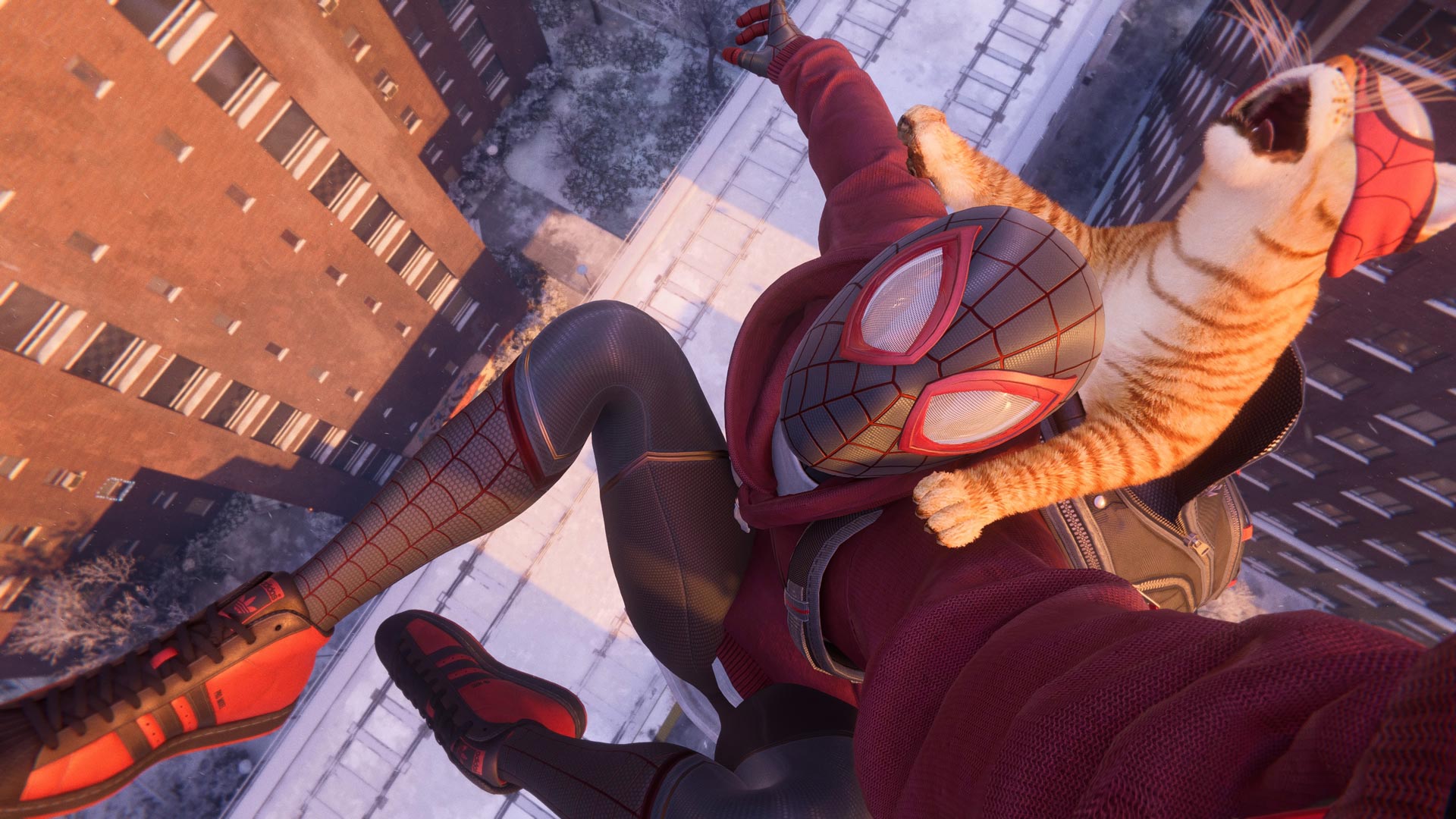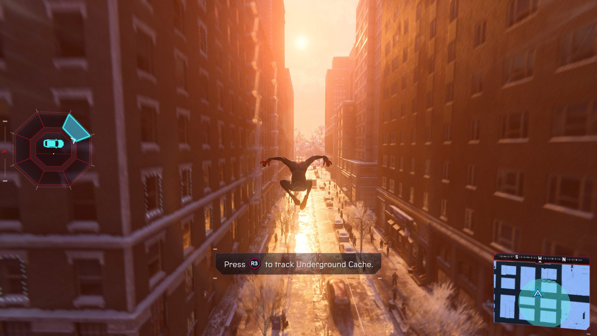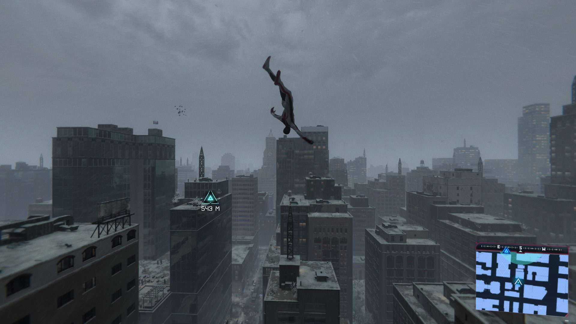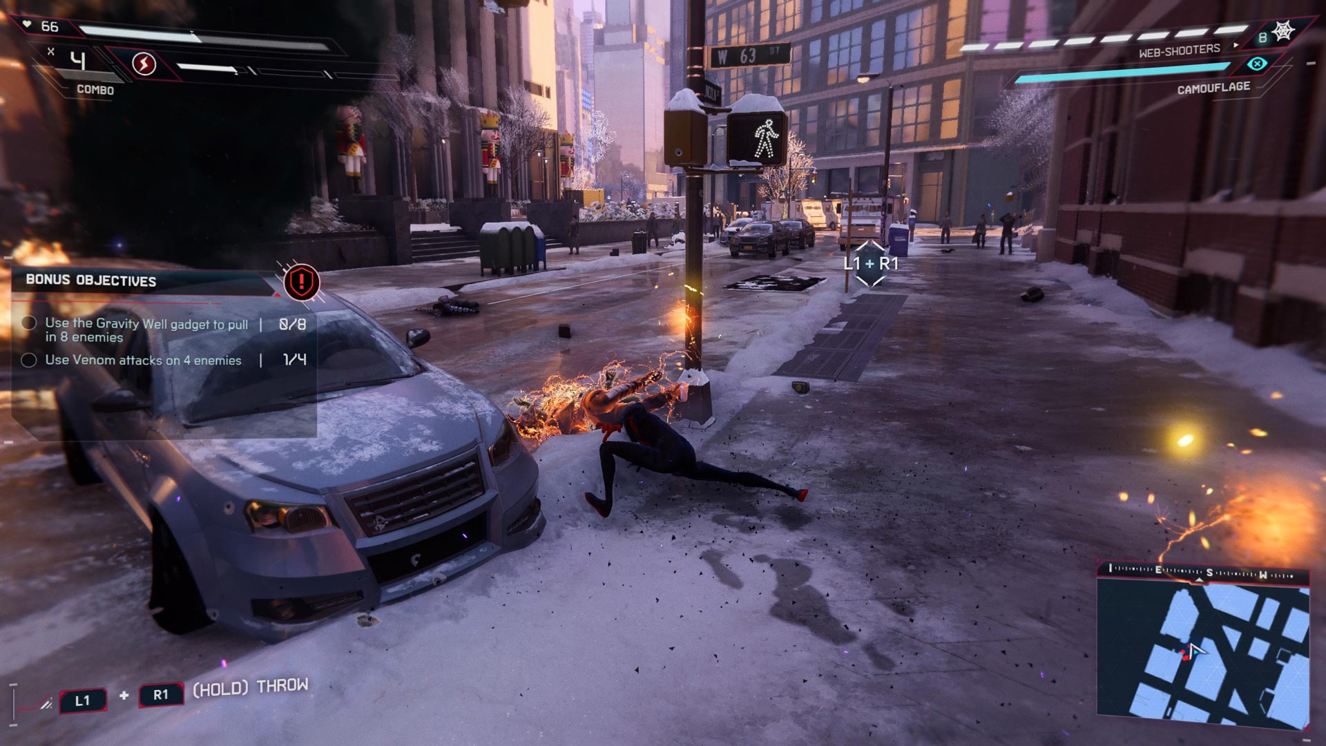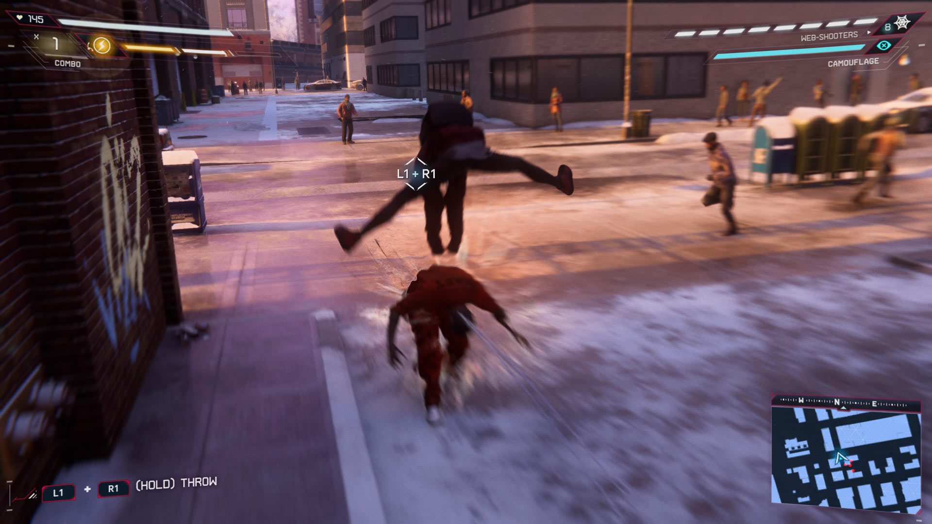 نیویورکی که بازی در آن جریان دارد نسبت به نسخهی قبلی غیر از برفی شدن تغییر خاصی نداشته، اما هنوز هم حیرتانگیز و چشمنواز است. پیادهسازی روان و هیجانانگیز مکانیکهای تاز زدن و تاب خوردن در آسمان شهر چیزی بود که اینسامنیاک با Spider-Man در آن شاهکار کرد و حالا همان ایدهها با بهبودهای اندک، ولی ملموسی در این بازی هم به کار گرفته شدهاند. مایلز به طور کلی تسلط کمتری در تاب خوردن نسبت به پیتر دارد، اما بازیگوشی و همچنین قدرتهای منحصر به فردش باعث شده بتواند حرکات بسیار جذاب و بامزهای بزند. تجربهی تار زدن بر فراز آسمانخراشها و اجرای حرکات آکروباتیکی که پارکوریستها در خوابشان هم نمیبینند، جادوی بینظیر بازی است که هرگز خستهکننده نمیشود. بازی یک حالت عکاسی هم دارد که عملا برای خود یک آتلیه تصویربرداری است و صادقانه بگویم که مدت زیادی از بازی را صرف فیگور گرفتن و ویرایش عکس کردم!