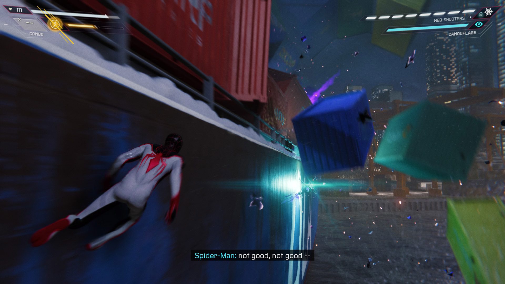 تواناییهای خاص مایلز شامل استفاده از نیروی الکتریسیته و نامرئی شدن است که درهای جدیدی به روی اینسامنیاک برای ارتقای گیمپلی نسبت به بازی قبل باز کرده است. به غیر فنون مبارزهی عادی مایلز با مشت، لگد و تار زدن که خود تنوع و هیجان فوقالعادهای دارند، او میتواند با ضربات برقی سهمگین، آسیب جدی به دشمنان وارد کند و این قابلیت او خصوصا در هنگام شلوغ شدن مبارزه بسیار به کار میآید. نوار مخصوص انرژی نشان میدهد که مایلز تا چه حد میتواند از الکتریسیته استفاده کند که مرور ارتقا مییابد و پر شدن آن به منزلهی امکان انجام حرکات فینیشر است. فینیشرها اگرچه تعدادشان خیلی زیاد نیست، اما کارگردانی و انیمیشن بسیار جذاب و هیجانانگیزی دارند که لذت از پا در آوردن دشمنان را چندین برابر میکنند، خصوصا آنهایی که شامل استفادهی مایلز از الکتریسیته میشود. قدرت نامرئی شدن مایلز که آن هم نوار مخصوص خودش را دارد، راههای زیادی برای مخفیکاری و غافلگیر کردن دشمنان پیشرویتان میگذارد و خصوصا در هنگام گره خوردن کار میتواند ناجیتان شود. متاسفانه یکی از ایرادهای اساسی بازی قبلی در Miles Morales هم به چشم میخورد و آن هم مشکلات دوربین در حین مبارزه است. طبیعتا عنوانی که در آن کنترل مرد عنکبوتی را برعهده دارید، نبردهایی بسیار شلوغ، پرسرعت و مملو از اکشن دارد و کاراکتر و دشمنان دائما در حال جابهجایی هستند. مشکل اینجاست که دوربین در بسیاری از مواقع نمیتواند پابهپای اکشن بازی حرکت کند. نتیجه این است که مخصوصا در محیطهای بسته، مایلز و دشمنان از دیدتان خارج میشوند و زمان زیادی را به مبارزه با در و دیوار سپری میکنید.