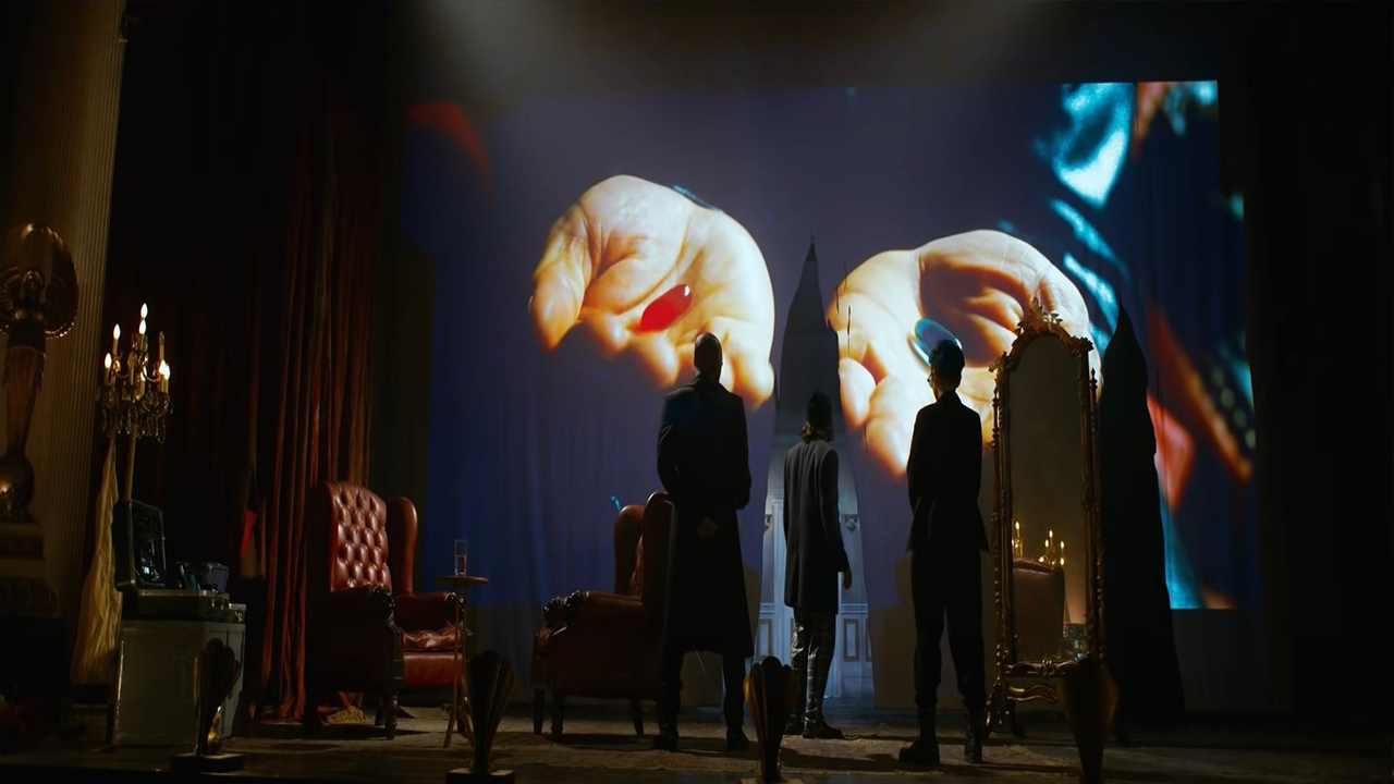 در صحنه بعدی تریلر، لحظه مکالمه فراموش نشدنی نسخه قدیمی مورفیوس با نئو در فیلم اول و بیان حقایق مختلفی که در مورد ماهیت بشریت وجود دارند، نمایش داده میشود. تریلر سکانس مطرح شده را در قالب ویدیویی که با پروژکتور در مقابل شخصیتهای جدید فیلم و صدالبته نئو در حال نمایش است، به نمایش میگذارد و پروتاگونیست فرنچایز مجددا با قرصهای آبی و قرمز رنگ مواجه میشود. این لحظه، درواقع یادآور زمانی است که مورفیوس به نئو پیشنهاد میدهد که با انتخاب هریک از این قرصها میتواند به زندگی روزمرهاش بازگردد یا چشمهایش را به روی حقیقتی که در اطرافش نهفته است، باز کند. همچنین از آنجا که در لحظه نمایش این ویدیو نسخه جدید مورفیوس در کنار نئو قرار گرفته است، پیشنهادی مشابه به نئو ارائه میشود.
