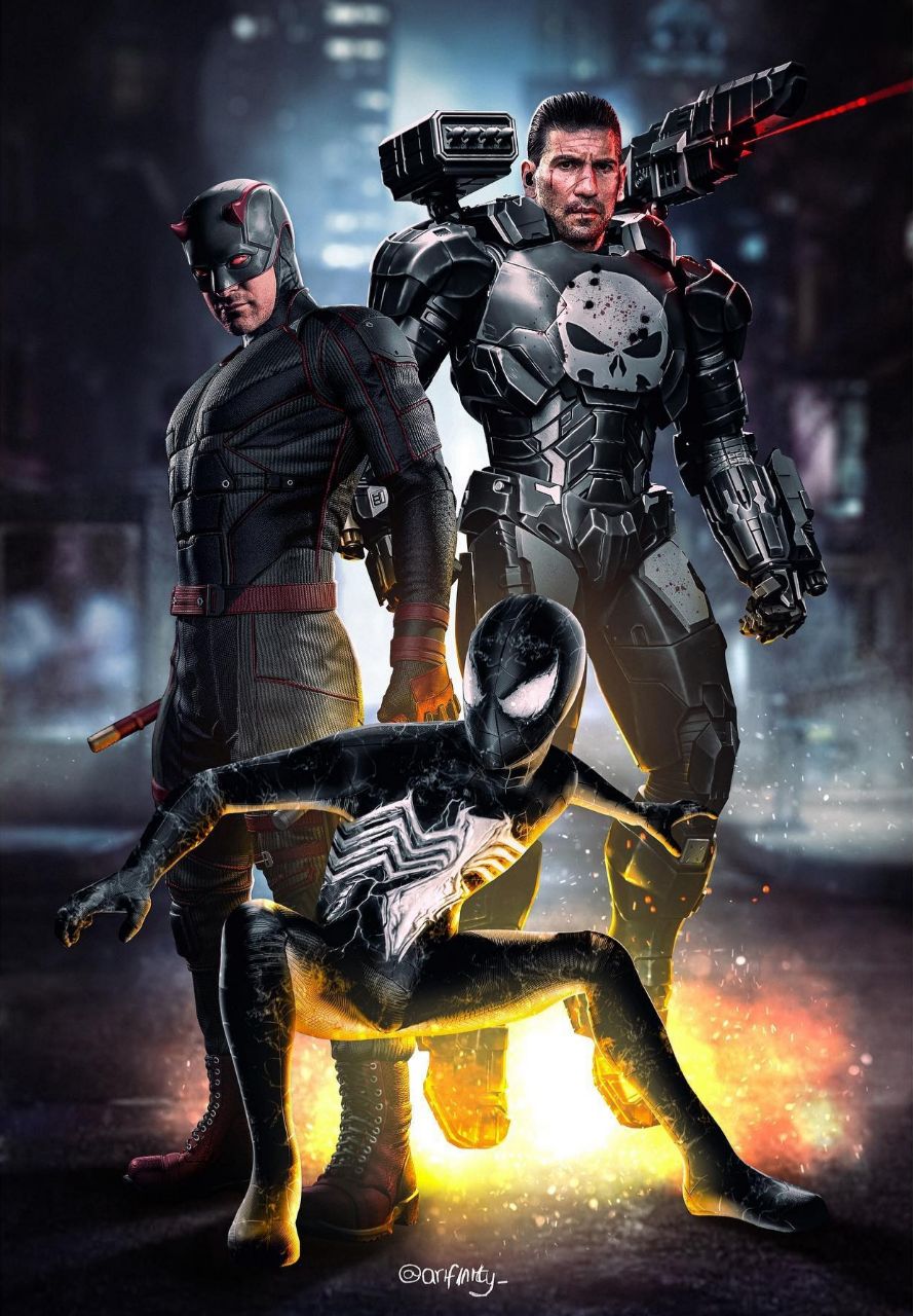 این پوستر که اسپایدرمن را در لباس سیمبیوتی، پانیشر را در زره آهنی تونی استارک و دردویل را در لباسی مشکی بهتصویر کشیده، با الهام از از کمیکهایی همچون Daredevil: Back in Black ،Avengers: Secret Wars و Marvel Armor Wars طراحی شده است. شاید دیدن چنین تیم آپی روی پرده نقرهای کمی دور از ذهن باشد، اما تصورش همچنان هیجان انگیز است.