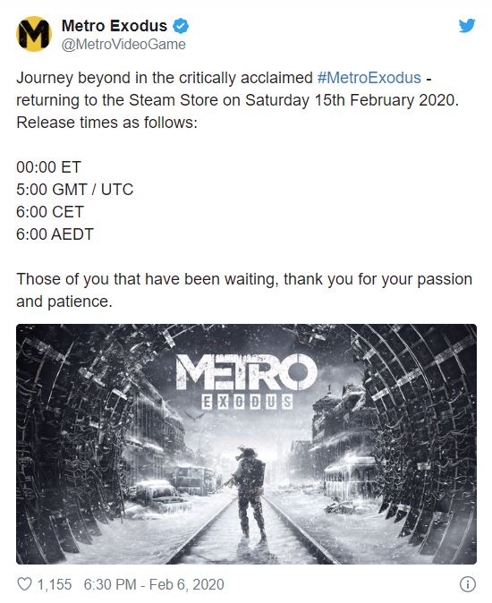 اگر از آن زمان تاکنون منتظر نسخهی استیم Metro Exodus بودید، خبر خوشی برای شما داریم. انتظارها به پایان رسیده است و جدیدترین نسخهی سری بازیهای مترو در تاریخ ۲۶ بهمن (مصادف با ۱۵ فوریه)، دقیقا یک سال پس از عرضه، روی استیم در دسترس قرار میگیرد. طبق قراردادی که مابین دیپ سیلور و اپیک گیمز امضا شده بود، Exodus باید به مدت یک سال در انحصار فروشگاه این شرکت میماند. سازندگان بازی در استودیوی 4A Games ضمن تایید انتشار این بازی روی استیم، ساعت دقیق عرضه در کشورهای مختلف را اعلام کردند. بدین ترتیب، علاقهمندان میتوانند بازی را در اسرع وقت خریداری کرده و فرایند دانلود فایلها را آغاز کنند.