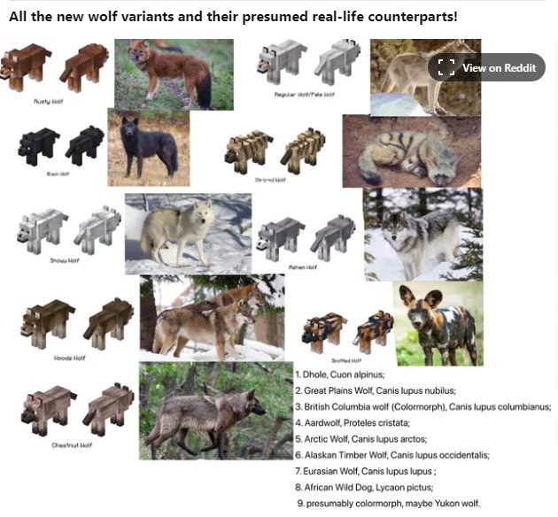 تصاویر ماینکرفت به اشتراک گذاشته شده توسط یکی از پلیرها بازی، منابع الهام واقعی گونههای مختلف گرگهایی که به تازگی به بازی اضافه شدهاند را نشان میدهد.