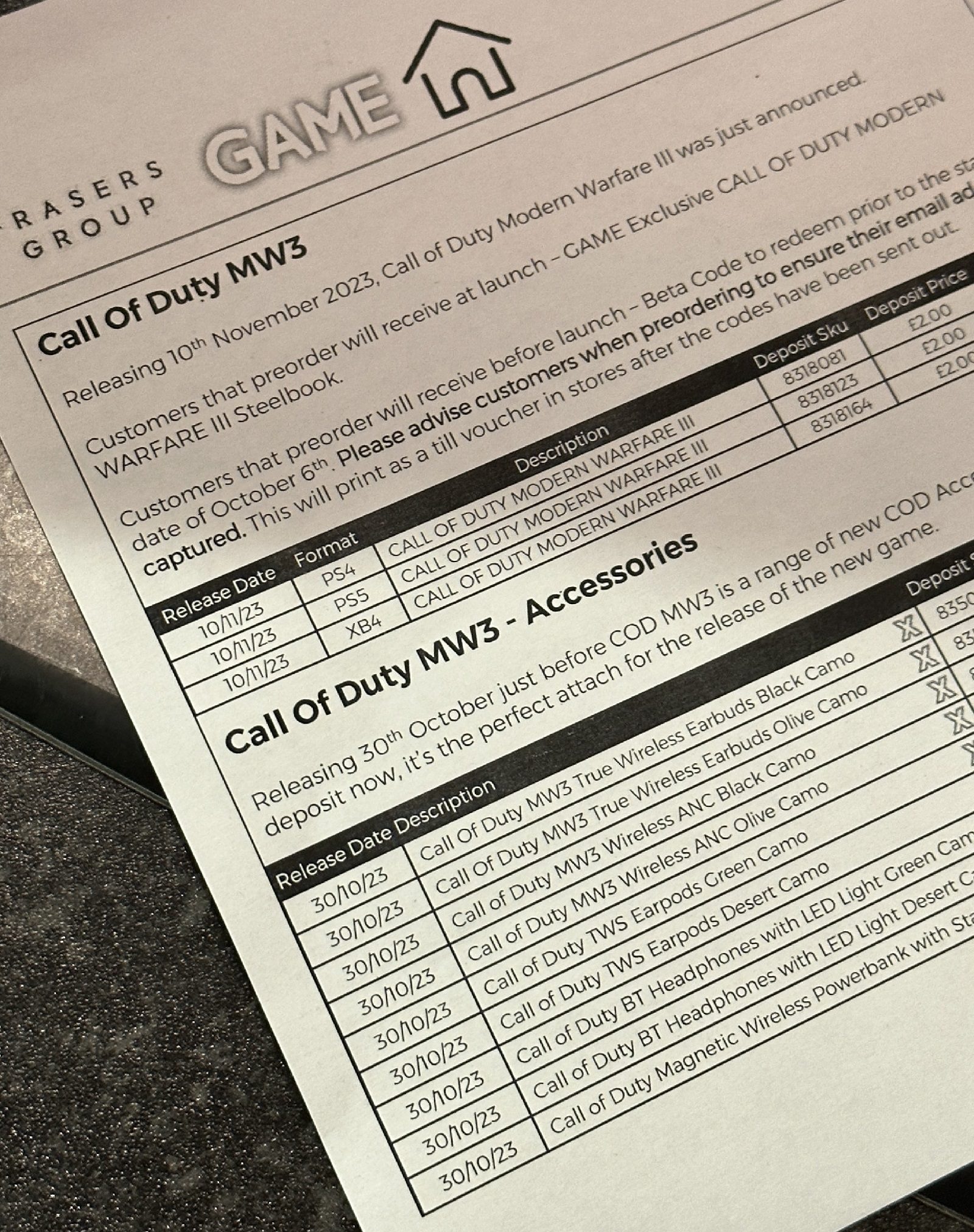 بر اساس تصویری که توسط فروشگاه معروف بریتانیایی به نام گیم (Game) لو رفته، گویا نسخه بتای بازی Call of Duty Modern Warfare 3 در روز جمعه، ۶ اکتبر سال جاری (۱۴ مهر ماه) در دسترس بازیکنها قرار خواهد گرفت. در این تصویر هیچ اشارهای به پلتفرمهای نسخه آزمایشی بازی نشده است.