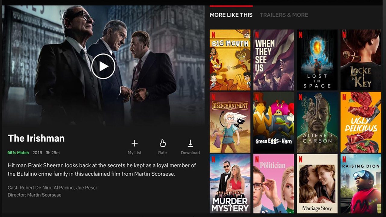 Netflix بر اساس فیلم و سریالهایی که کاربر طی چند وقت اخیر تماشا کرده، مواردی را پیشنهاد میدهد. متاسفانه این موارد چندان کاربردی نبوده و مشترکان بهتر است برای یافتن آثار مرتبط با ژانرها یا زیرژانرهای مورد نظرشان به وب سایتهای معتبر مراجعه کرده یا از دوستان و آشنایان خود پرس و جو کنند.