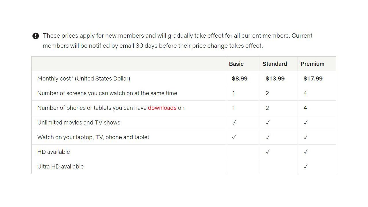 اشتراکهای نتفلیکس طی سالهای اخیر بارها افزایش یافته که همین موضوع انتقادهای زیادی را به همراه داشته است. بیشتر شدن قیمت اشتراکها، نتیجهی افزایش هزینههای ساخت فیلمها و سریالهای اورجینال و همچنین قراردادهایی مختلفی است که شرکت برای به دست آوردن امتیاز پخش محصولات مختلف امضا میکند.