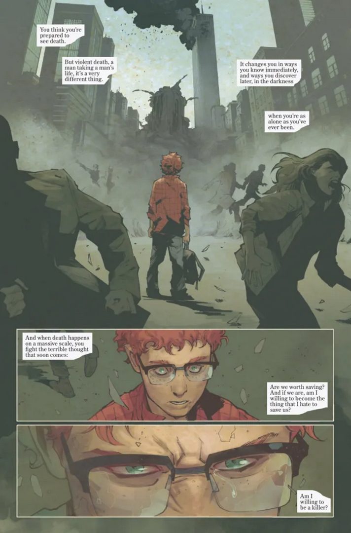 در همین حال، روایت کمیک با فلشبکهایی همراه است از پسر جوانی که در کودکی شاهد حملات تروریستی ۱۱ سپتامبر بوده است. این تجربه هولناک تأثیر عمیقی بر او گذاشته و تصمیم میگیرد همانند کاپیتان آمریکا تبدیل به یک قهرمان واقعی شود، حتی اگر جسمش او را یاری نکند.
