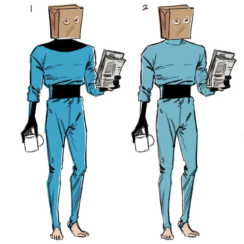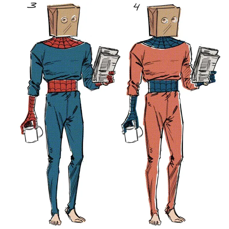 در کمیکها، وقتی پیتر با کمک رید ریچاردز خود را از سیمبیوت ونوم جدا میکند، لباسش را از دست میدهد. بههمین خاطر یکی از لباسهای قدیمی جانی استورم را قرض گرفته و از یک کیسه کاغذی نیز برای پوشاندن صورت خود استفاده میکند. این لباس حتی برای لحظهای در تریلر Spider-Verse 2 نمایش داده شد که نشان میدهد تیم سونی چقدر به تاریخ هشتاد ساله مارول کمیکس وفادار هستند.