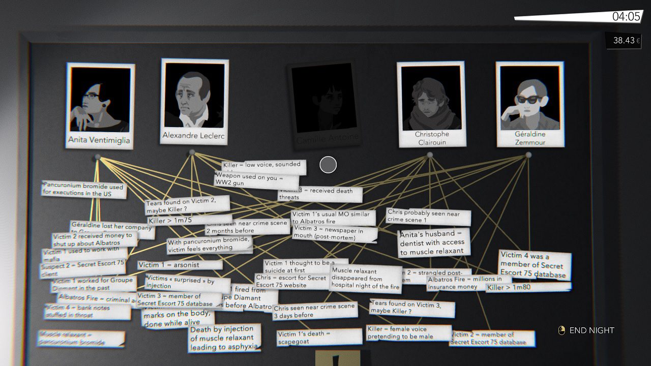 پیش از آغاز بازی، باید میان سه پرونده قتل سریالی که در زمینه انگیزه قاتل، هویت قربانیها و جزئیات داستان با هم متفاوت هستند، یکی را انتخاب کنید. پیشزمینه هر سه داستان یکسان است که شامل همان ماجرای مجروح شدن و اخاذی پلیس از حسین میشود اما بسته به آنکه کدام درجه سختی را برمیگزینید، مدیریت منابع مالی حسین سختتر شده و احتمال یافتن سرنخها پایینتر میآید. پس از پایان هر شب، اطلاعاتی را که بهدست آوردهاید، روی دیوار خانهتان کنار هم گذاشته و سعی میکنید میان آنها و ۵ مظنون ارتباط برقرار کنید.