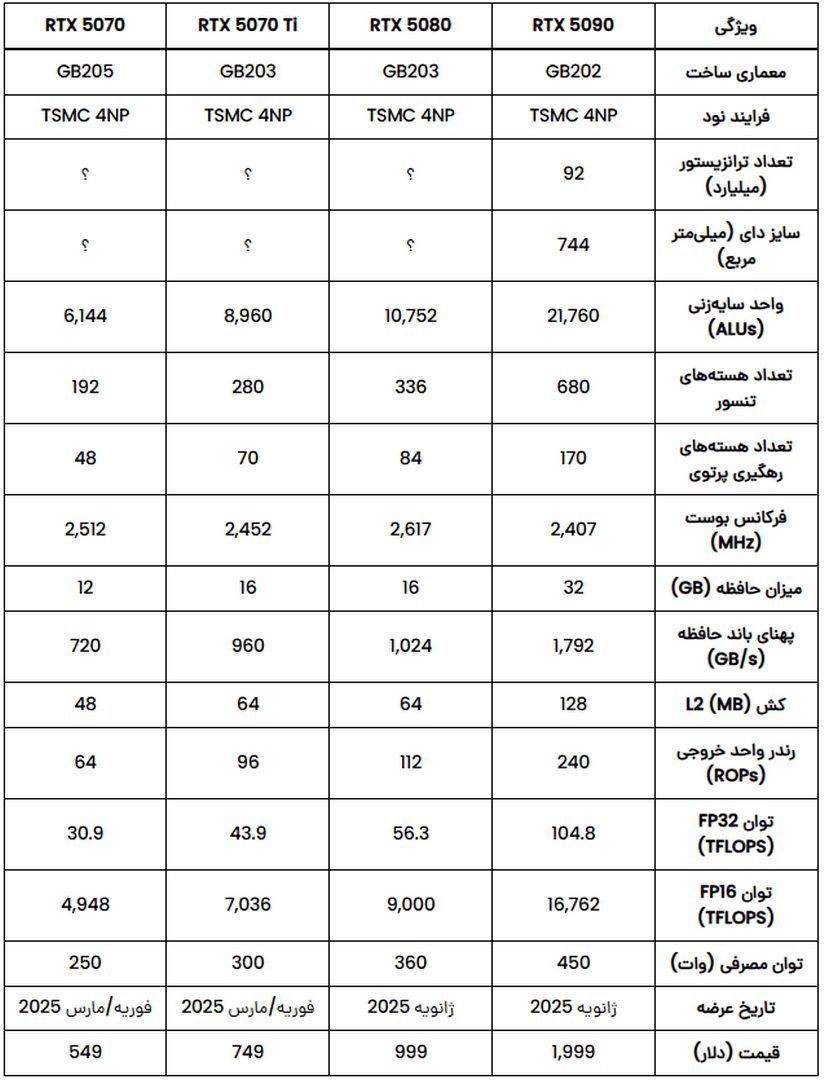 کارتهای سری RTX 50 انویدیا علاوه بر بازی، در کاربردهای حرفهای مانند پردازشهای یادگیری ماشینی و هوش مصنوعی نیز عملکردی فوقالعاده ارائه میدهند. به عنوان مثال، کارت RTX 5090 با توان پردازشی بالا، قادر به انجام کارهایی مانند شبیهسازیهای پیچیده، رندرینگ حرفهای و کاربردهای دیتاسنتری است. البته کارتهای دیگر هم مشخصات فنی بسیار خوبی دارند که در جدول زیر به همه آنها اشاره شده است.