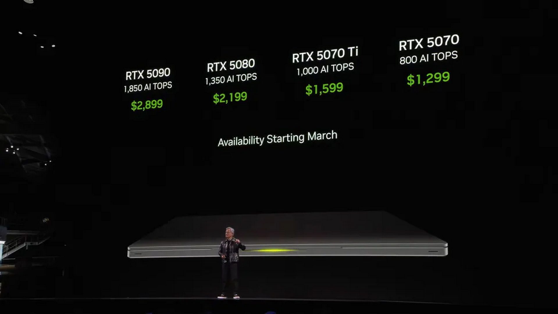 علاوه بر کارتهای گرافیک دسکتاپ، انویدیا از سری جدید کارتهای گرافیک لپتاپ نیز رونمایی کرد. این سری شامل مدلهای RTX 5090، RTX 5080، RTX 5070 Ti و RTX 5070 خواهد بود که قرار است از ماه مارس 2025 در دسترس قرار گیرند. هرچند که نام این مدلها با نسخههای دسکتاپ مطابقت دارد، اما عملکرد آنها بهطور قابل توجهی پایینتر خواهد بود. کارت گرافیک لپتاپ RTX 5080 به 1,350 AI TOPS کاهش یافته که کمی کمتر از نسخه دسکتاپ RTX 5070 Ti است. همچنین مدل RTX 5070 Ti لپتاپ همان 1,000 TOPS نسخه دسکتاپ RTX 5070 را ارائه میدهد. در نهایت، نسخه RTX 5070 لپتاپ با حداکثر 800 AI TOPS عرضه خواهد شد. کارتی که احتمالاً مشخصات فنی و قدرت مشابهی با کارت دسکتاپ RTX 5060 Ti آینده دارد.