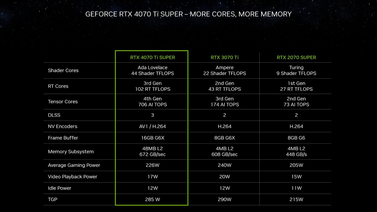 مدل بعدی، RTX 4070 Ti سوپر است؛ یک کارت فوقالعاده برای کسانی که بودجهی کمتری دارند و میخواهند در وضوح 1440P بهترین تجربه را از انجام بازی با رفرشریت 144 هرتز داشته باشند. این کارت گرافیک 800 دلاری هم 16 گیگابایت حافظه GDDR6 دارد و در مقایسه با نسخهی استاندارد خودش ۱۵٪ و در مقایسه با RTX 3070 Ti حدودا ۲٫۵ برابر در تولید فریم بهتر عمل میکند. این کارت یک هفته زودتر از مدل بالا یعنی در ۴ بهمن ماه عرضه میشود.