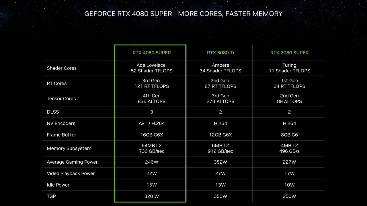 قدرتمندترین کارت این سری RTX 4080 سوپر است که از ۱۶ گیگابایت حافظهی اختصاصی از نوع GDDR6 با پهنای باند ۷۳۶ گیگابایت بر ثانیه بهره میبرد و قادر است بازیهای روز را در وضوح 4K به اجرا در بیاورد. این کارت از ۱۰٫۲۴۰ هستهی پردازشی کودا بهره میبرد و فرکانس آن در حالت پایه و مکس به ۲۲۹۵ و ۲۵۵۰ مگاهرتز میرسد که فوقالعاده محسوب میشود. این کارت در مقایسه با RTX 3080 Ti که یکی از قدرتمندترین کارتهای تاریخ انویدیا محسوب میشود، دو برابر در تولید فریم بهتر عمل میکند.