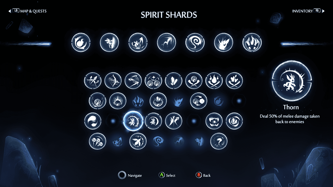 فارغ از حلقهی دوازدهگانهای که به آن اشاره کردم، بخش دیگری برای قابلیتهای Ori، با نام Spirit Shards به بازی اضافه شده که در این بخش با ۳۱ قابلیت جدید مواجه میشوید. میتوان این قابلیتها را در چالشهای داخل بازی به دست آورد و همینطور میتوان برخی از آنها را از یک NPC به نام Twillen خریداری کرد. اضافه کنم همین شخصیت برای ارتقای Spirit Shards به کارتان میآید. نکتهی جذاب ماجرا در خصوص نحوهی استفاده از این قابلیت است؛ به این صورت که در ابتدا بازیکن فقط سه اسلات برای انتخاب و استفاده از این تواناییها دارد اما بعدا با انجام ماموریتهای خاصی میتواند تعداد اسلاتهای خود را تا ۸ عدد افزایش دهد. از بین Spirit Shard های مورد علاقهی خودم، میتوانم به Sticky ،Triple Jump و Ultra Grapple اشاره کنم. Spirit Shardها روی مبارزه، حرکت و بسیاری از موارد دیگر، تاثیر مستقیم دارند؛ اما بدون بعضی از آنها نیز میتوان بازی را تمام کرد.