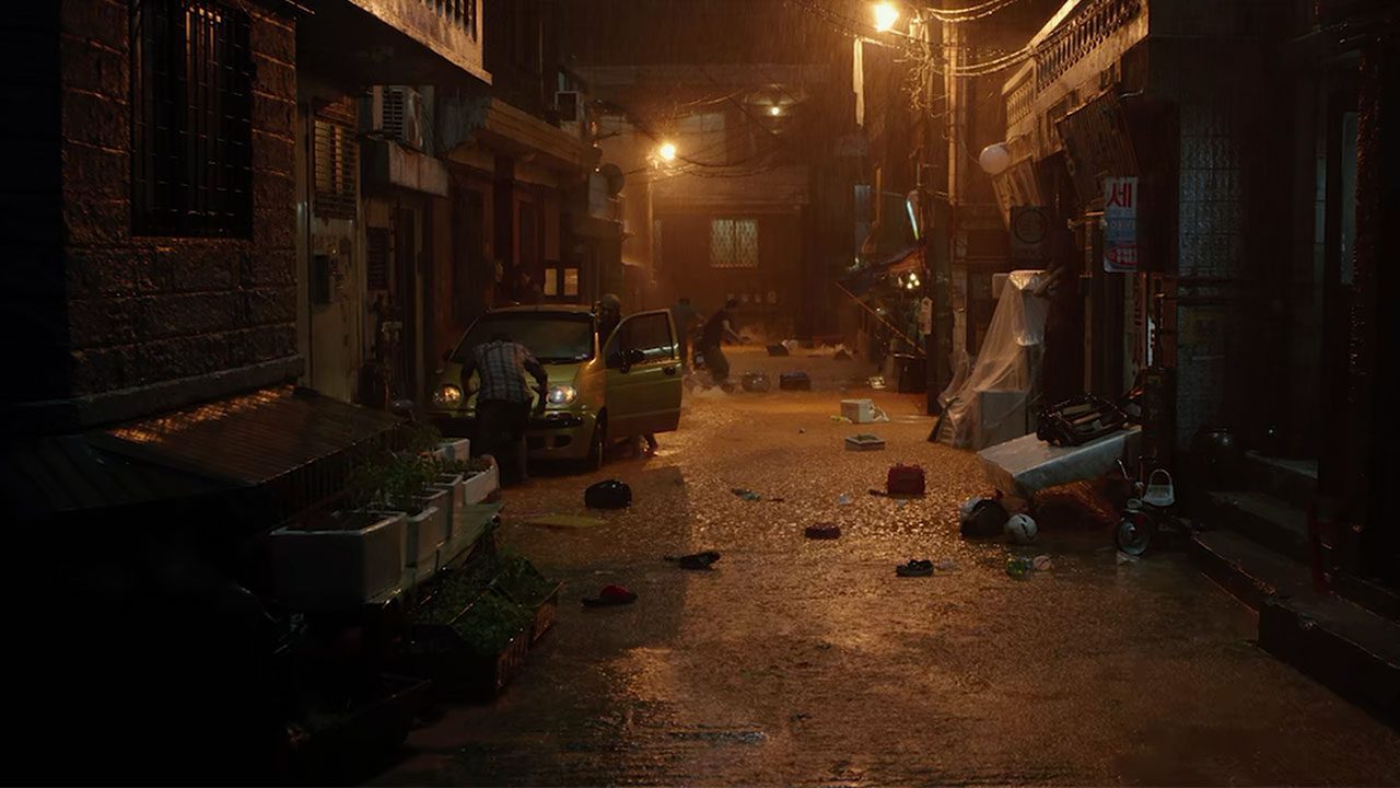 این یک صحنه بوده. لوکیشنهای واقعی با ظاهر مشابه هم در کره وجود دارد، اما ما این صحنه را خودمان ساختیم تا بتوانیم کل محله را زیر آب ببریم. با این حال میخواستیم که شبیه به یک صحنه [مصنوعی] نباشد. ما به فضا بهعنوان یک بازیگر نگاه میکردیم. من به واحد هنر و طراحی صحنه گفته بودم که به جای ساخت محله نیمه زیرزمینی کیتائک، باید آن را از جای دیگر بیاوریم.