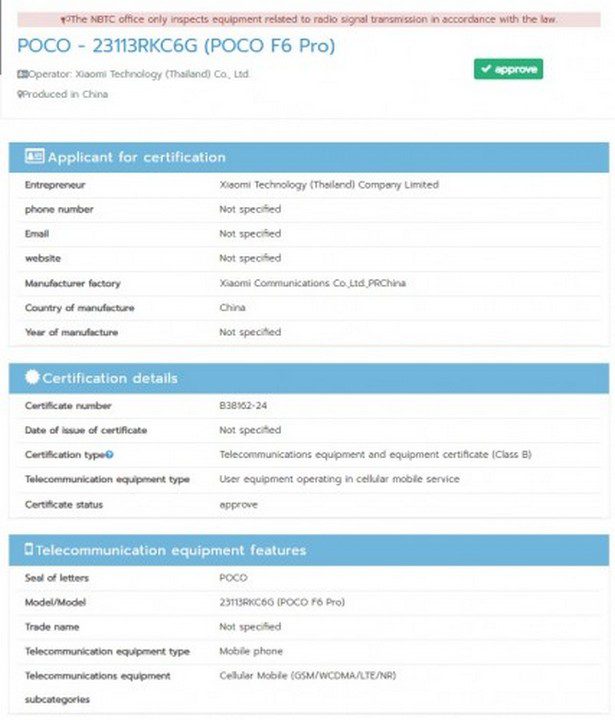 به تازگی یک سازمان صدور گواهی تایلندی با نام NBCT این گوشی را گواهی کرده است. اما متأسفانه در این وبسایت خبری از مشخصات فنی این گوشی نیست. در این صفحه آمده که 23113RKC6G شماره مدل این گوشی خواهد بود. بدین ترتیب پوکو F6 پرو همان ردمی K70 با برند پوکو خواهد بود.
