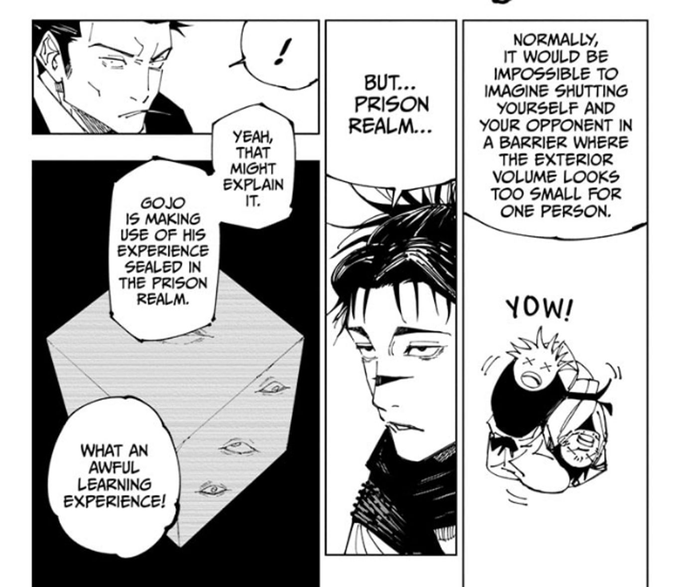 گوجو در حالی که در قلمرو زندان گیر افتاده بود، تمرینهای زیاد باعث افزایش قدرت گوجو در زمان آزاد شدن شد. یک تئوری بنیادی فیزیک معتقد است که زمان نسبی است، و این به ویژه در مورد مدت زمانی که جادوگر جوجوتسو کایسن ساتورو گوجو (Satoru Gojo)، در قلمرو زندان مهر و موم شده بود هم صادق است.